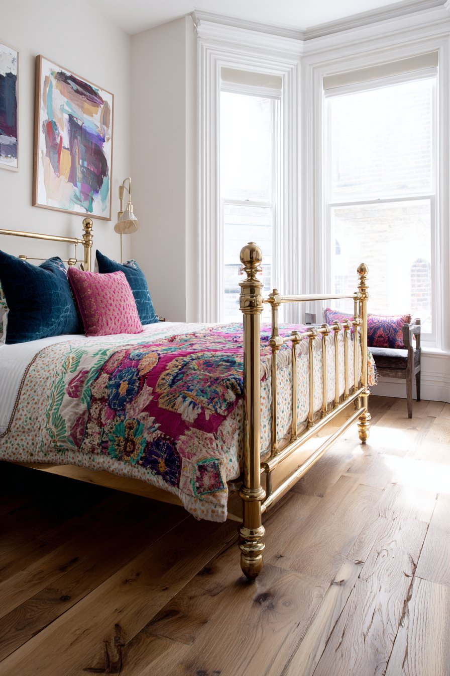 A rich bedroom showcases eclectic luxury through mixed time periods. Victorian-era brass bed frame refinished in polished gold anchors the space. Modern abstract artwork and contemporary lighting fixtures surround it. Bedding combines vintage-inspired embroidered coverlet with modern geometric pillows. Refinished hardwood floors with hand-scraped texture provide foundation.
