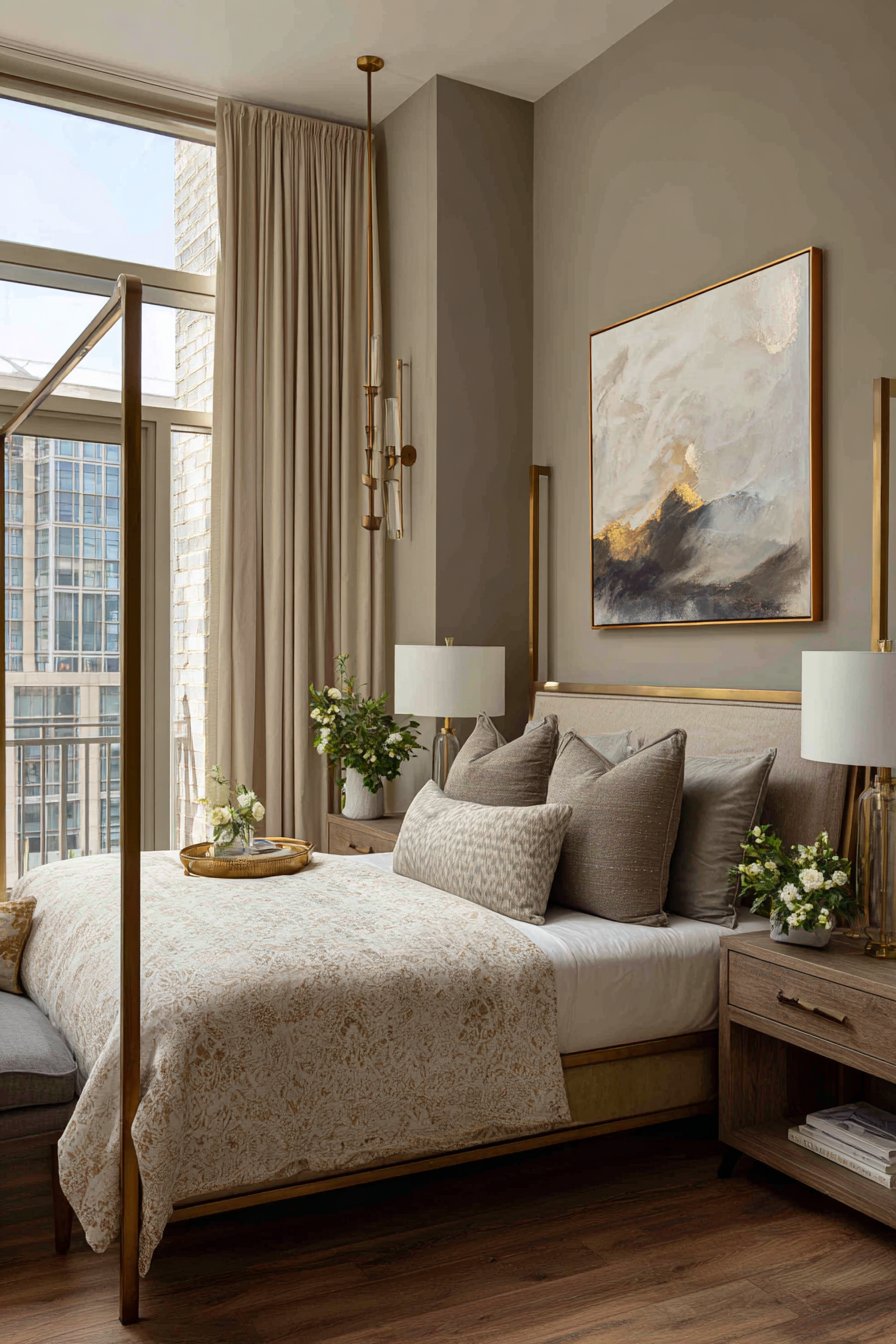 This design approach works especially well in smaller bedrooms. Mirrors expand perceived space while adding glamour. The blush and chrome palette feels feminine without being overly sweet. The space demonstrates sophisticated restraint within a glamorous framework.