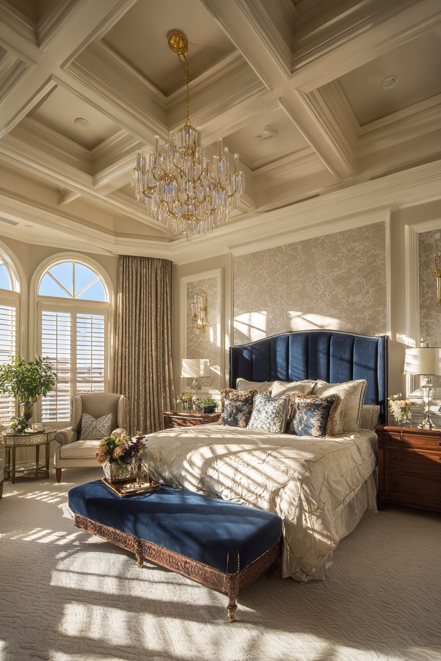 A sophisticated bedroom features a statement coffered ceiling in warm ivory tones. Subtle gold leaf accents catch the light from multiple sources. This architectural detail draws the eye upward immediately. The upholstered bed showcases a channeled velvet headboard in sapphire blue. Brass nailhead trim defines the edges with precision.