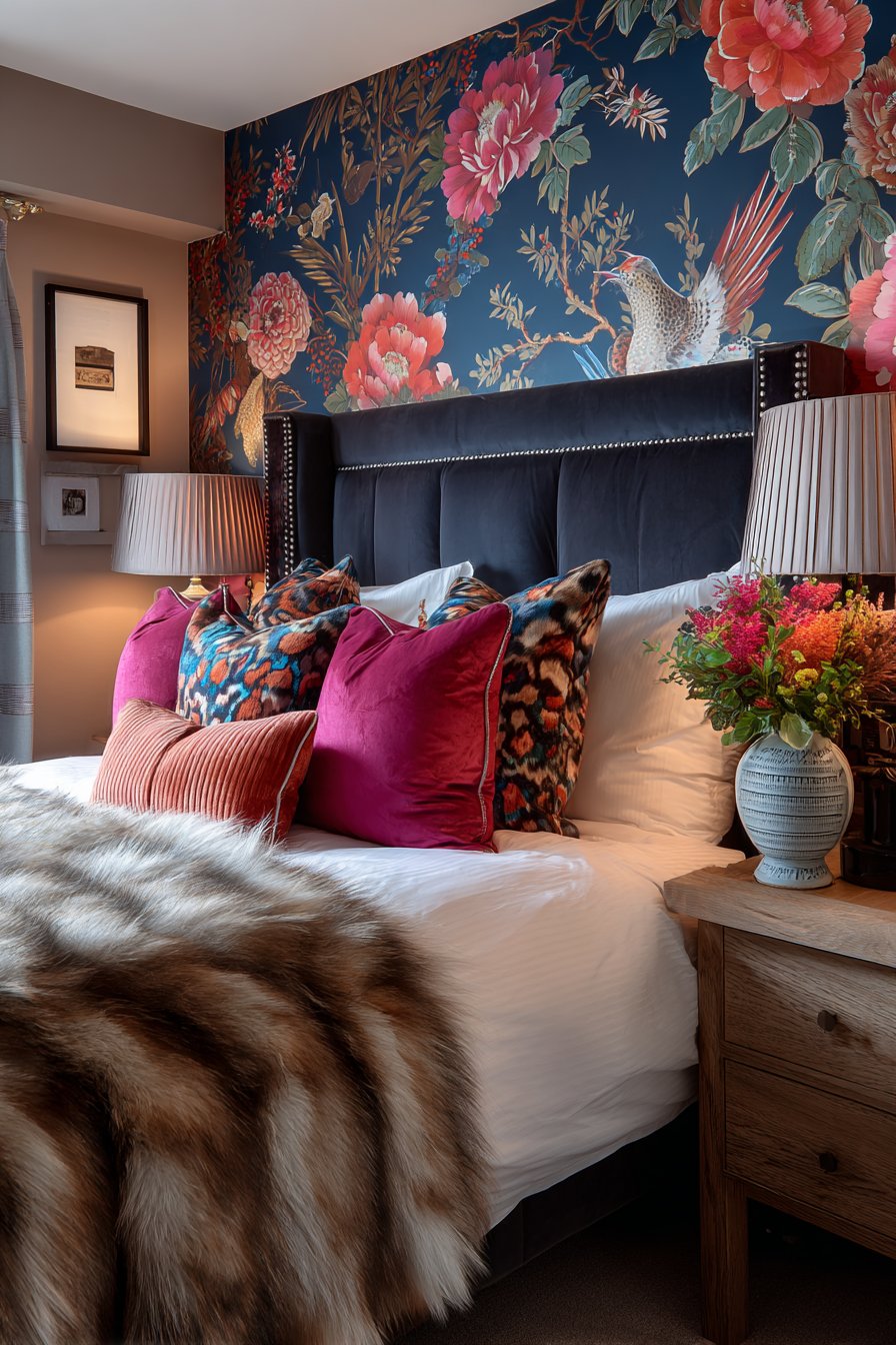 The pattern complexity demands careful coordination throughout the space. Yet the navy and gold create cohesion despite abundant detail. This bedroom proves that maximalism works when anchored by consistent color themes. Natural material representation remains crucial even in bold designs.