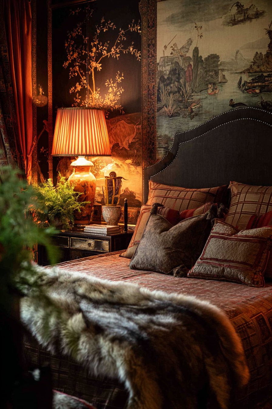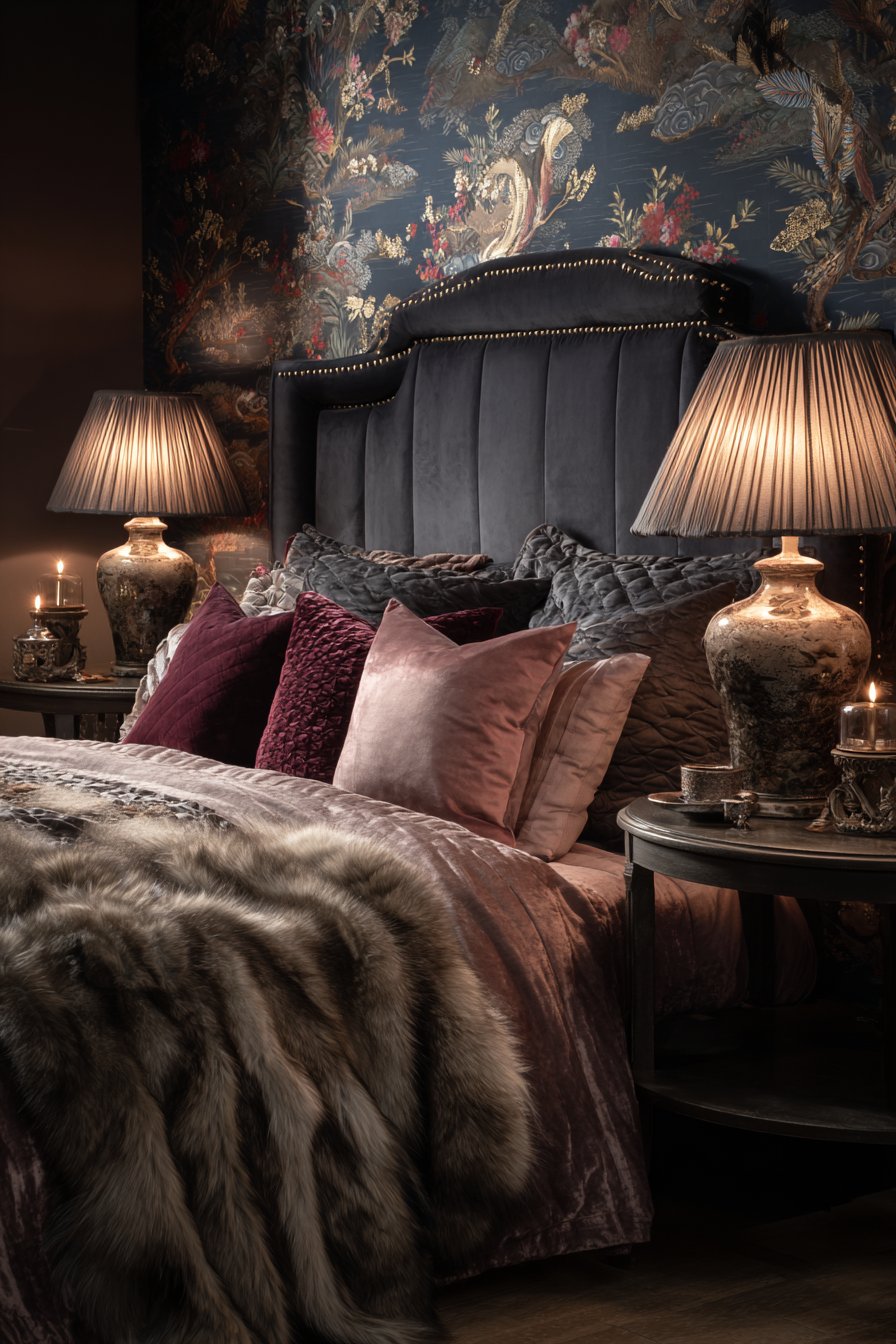 Layered luxury linens include silk duvet and fur throw. Each layer adds textural interest and comfort. Matching table lamps with ceramic bases flank the bed symmetrically. Pleated shades diffuse the light beautifully. Professional photography with balanced exposure shows how warm artificial lighting enhances the rich color palette.