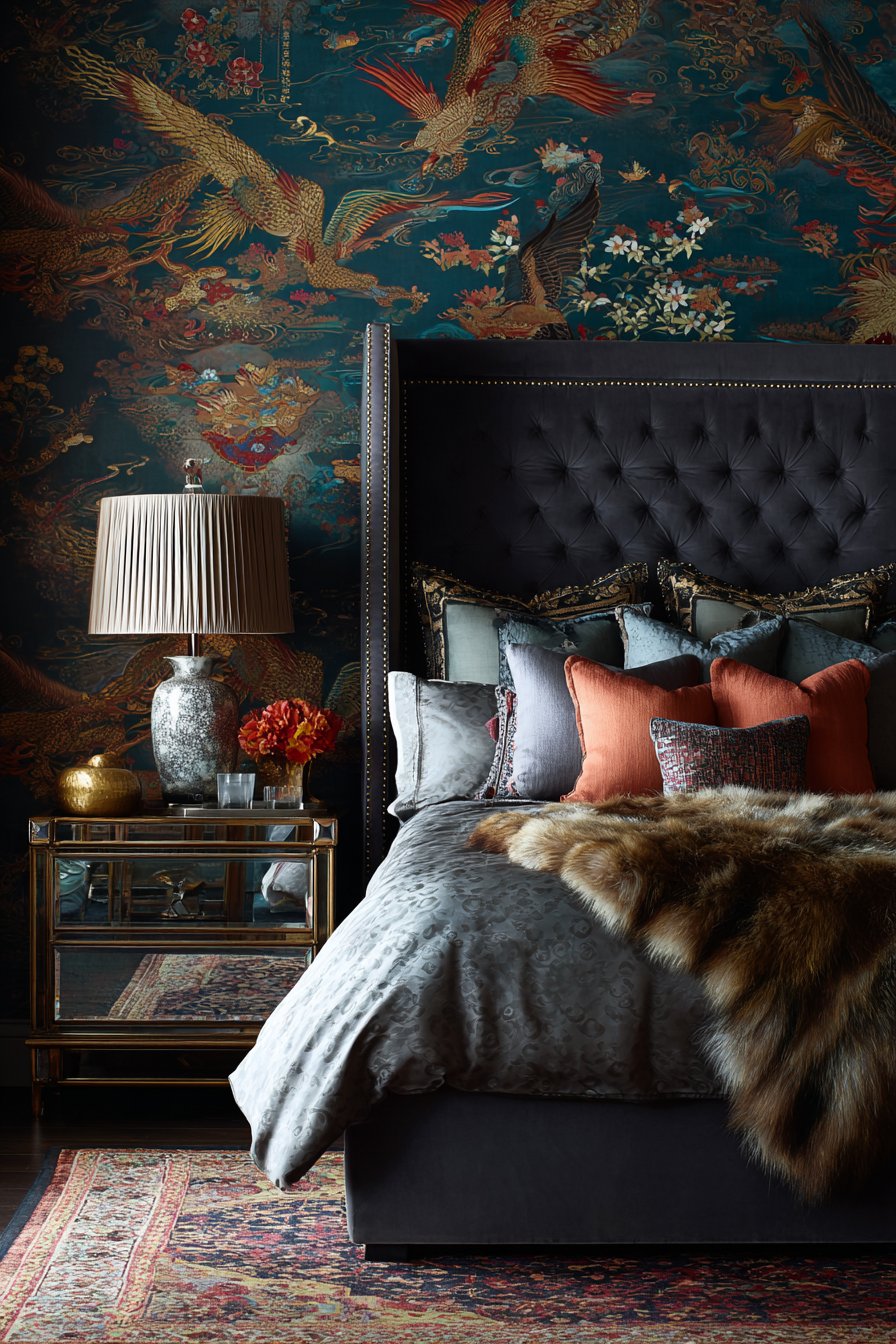 A maximalist bedroom displays dramatic wallcovering in a chinoiserie pattern. Metallic gold elements shimmer against navy background. The exotic imagery creates visual drama and conversation. The bed features a tall upholstered headboard in charcoal velvet. Decorative brass studs define the edges with gleaming precision.