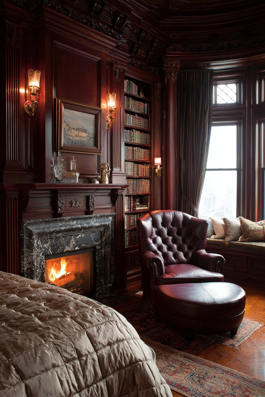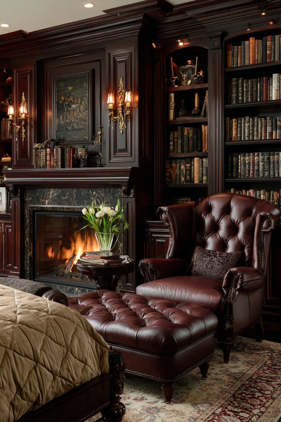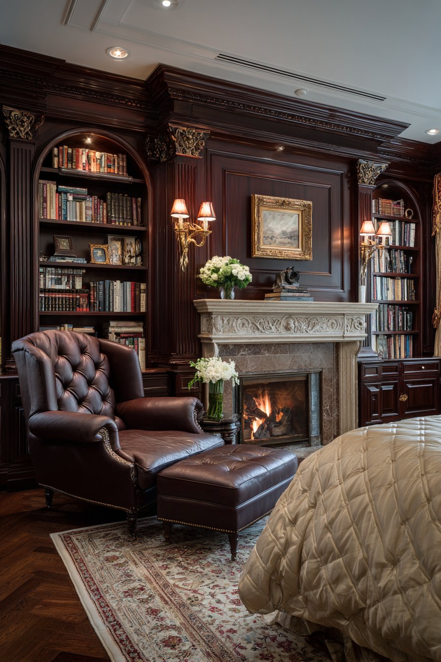 Floor-to-ceiling built-in bookcases in mahogany flank a gas fireplace. The ornate marble surround adds classical elegance to the fireplace opening. This bedroom doubles as a private library and reading sanctuary. A tufted leather wingback chair and ottoman create the perfect reading nook. They rest upon an oriental rug with traditional patterns.