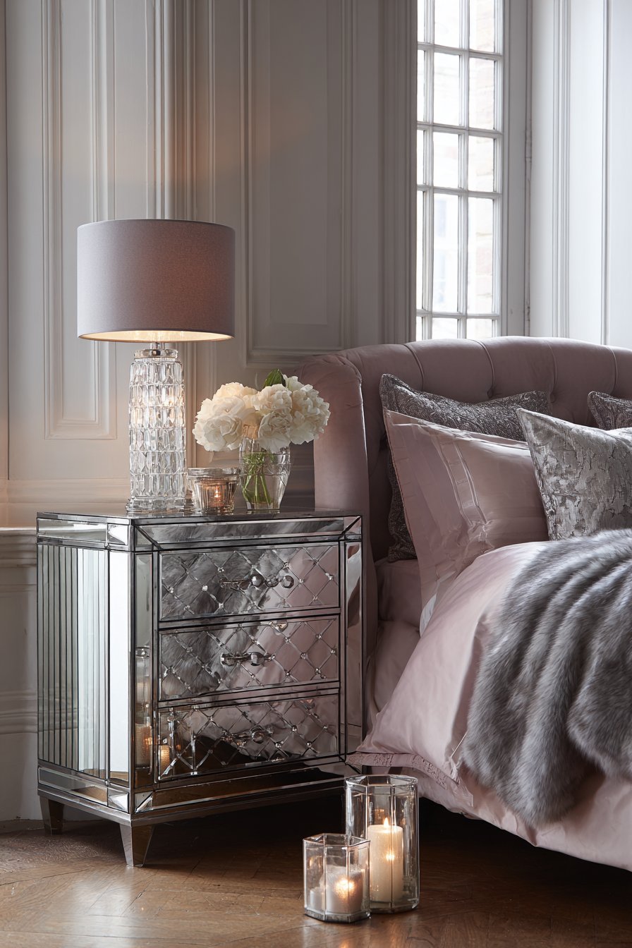 A glamorous bedroom features mirrored furniture throughout the space. Nightstands with crystal knobs reflect light from multiple angles. A beveled mirror dresser multiplies the soft lighting beautifully. The bed showcases a curved upholstered headboard in blush velvet. Diamond tufting creates dimensional texture across the surface.