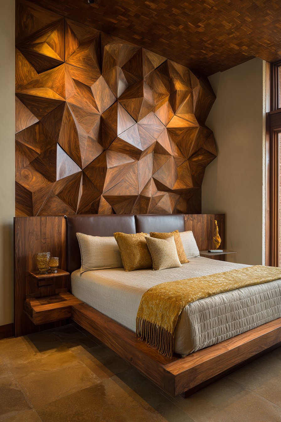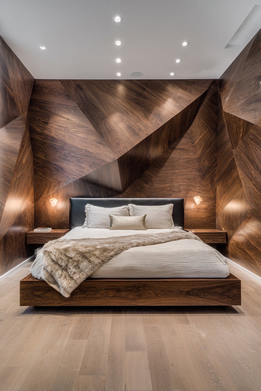 A rich bedroom retreat features dramatic accent wall with three-dimensional geometric wood paneling. The walnut displays subtle grain variations throughout. This dimensional treatment creates shadow and light play. A platform bed in matching walnut includes integrated leather-upholstered headboard section. Built-in nightstands with hidden LED lighting provide modern convenience.