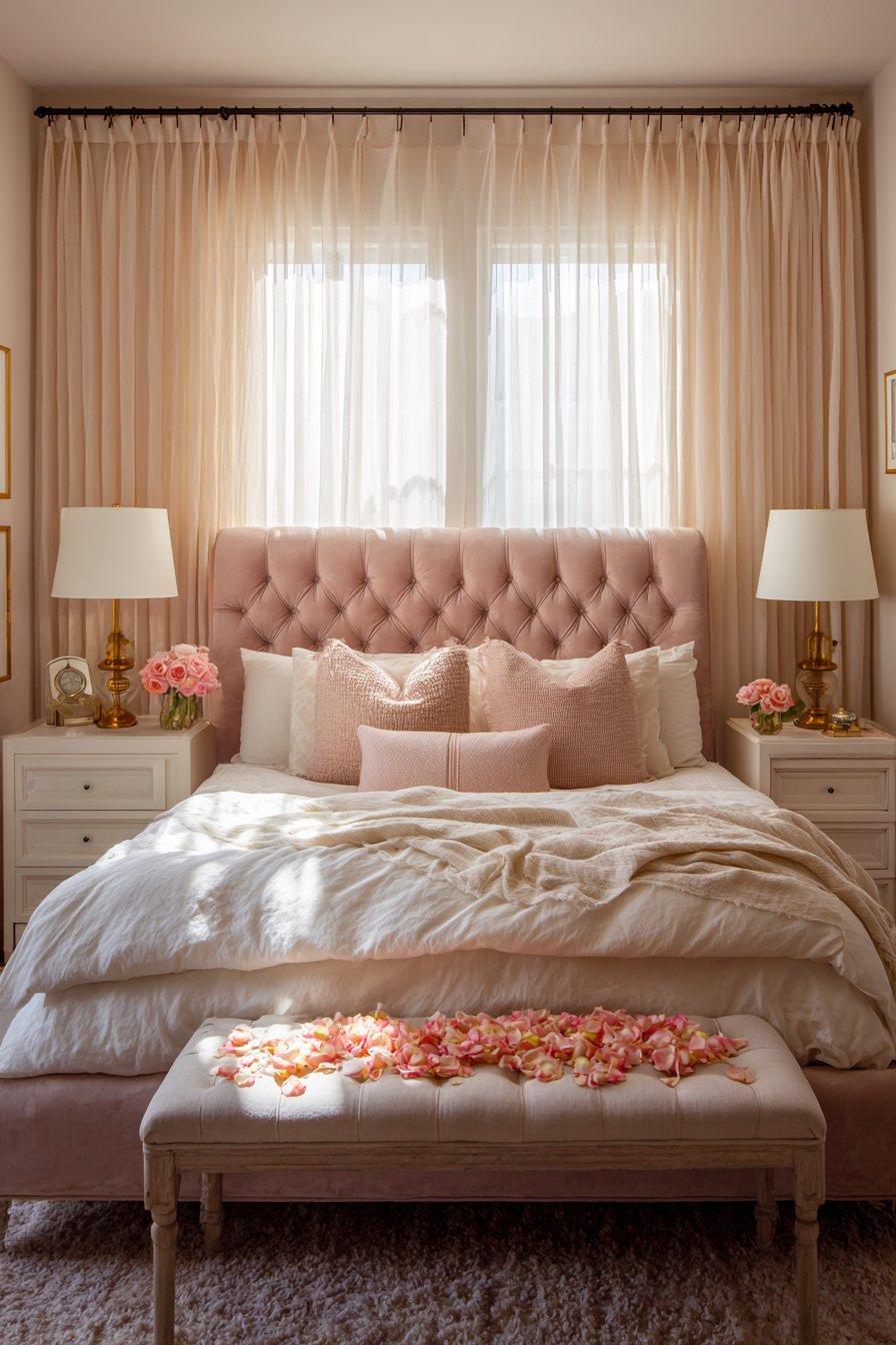 A king-size upholstered bed anchors this romantic space with its tufted headboard in soft blush velvet. Layers of ivory silk sheets create a cloud-like foundation. Dusky rose throw pillows add depth and visual interest. The fabric choices alone speak to luxury and comfort.