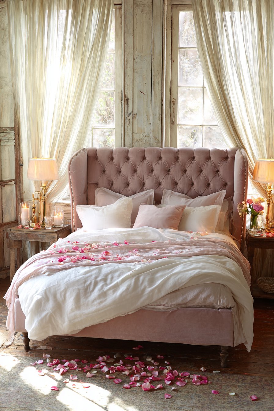 Vintage brass table lamps sit atop flanking nightstands. Cream linen shades cast intimate pools of light. These fixtures provide perfect reading illumination while maintaining romantic ambiance. Fresh rose petals scattered across crisp white bedding add an unexpected luxurious touch.