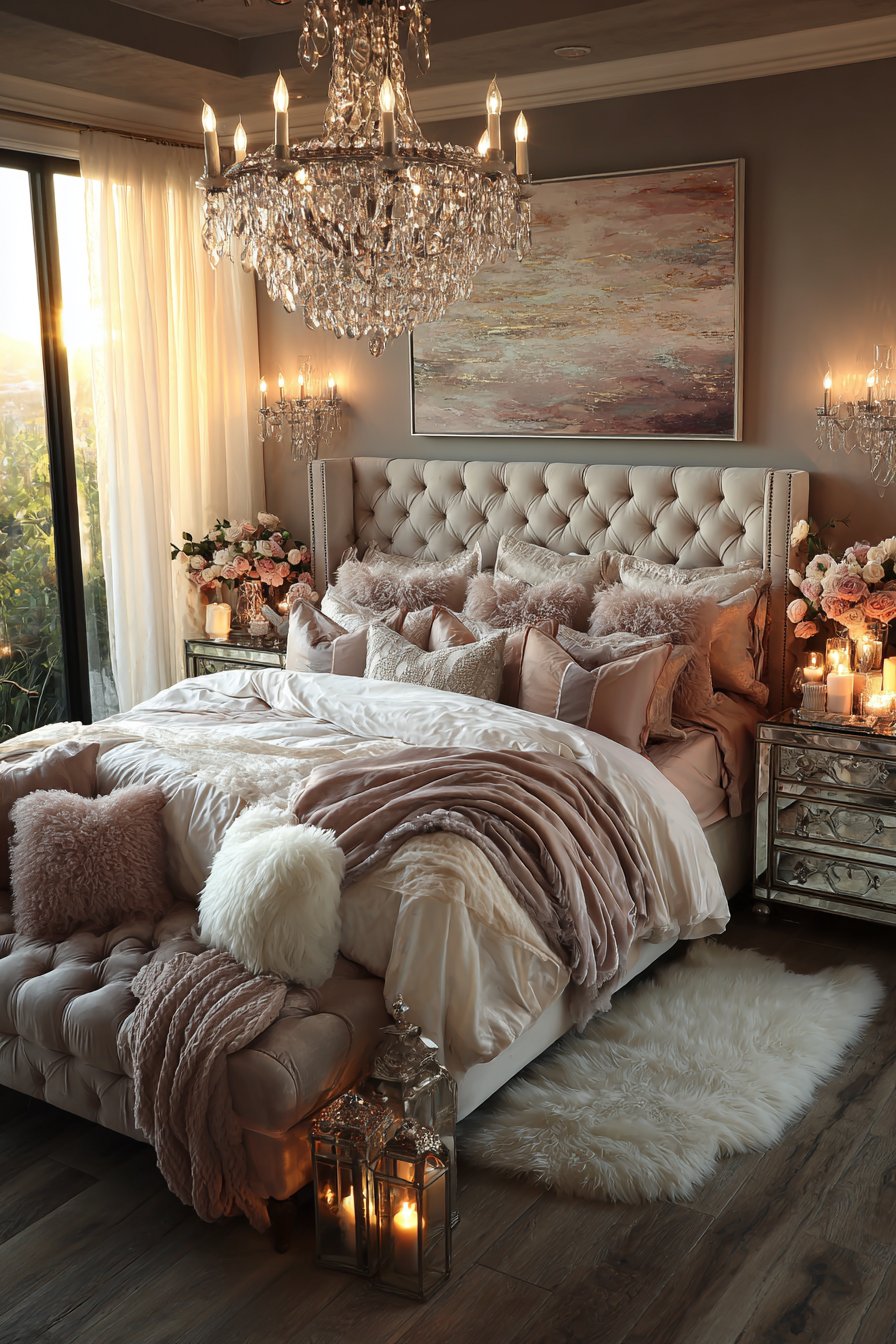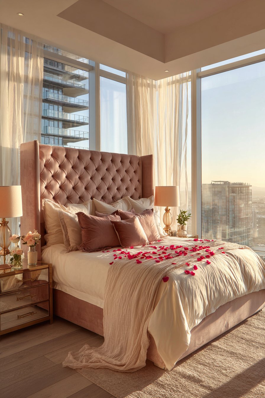 Wide-angle interior photography captures the romantic glam aesthetic completely. Attention to tufting details, crystal accents, and layered lighting creates the ultimate date night ambiance. This maximalist approach demonstrates how dramatic elements create unforgettable romantic spaces. The rose velvet adds feminine elegance throughout.