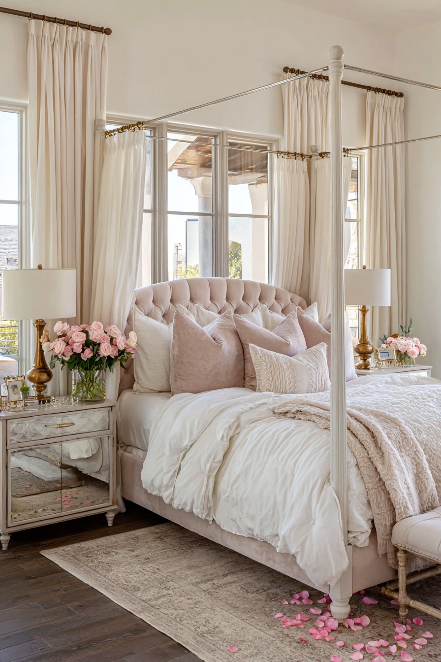 Golden hour natural light filters through Roman shades with perfect timing. Wide-angle interior design photography shows the complete romantic setting comprehensively. Balanced exposure highlights reflective surfaces and textile details equally. This design demonstrates how mirrors amplify both light and romantic atmosphere.