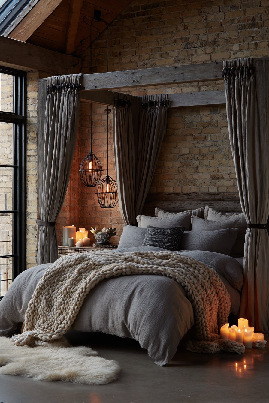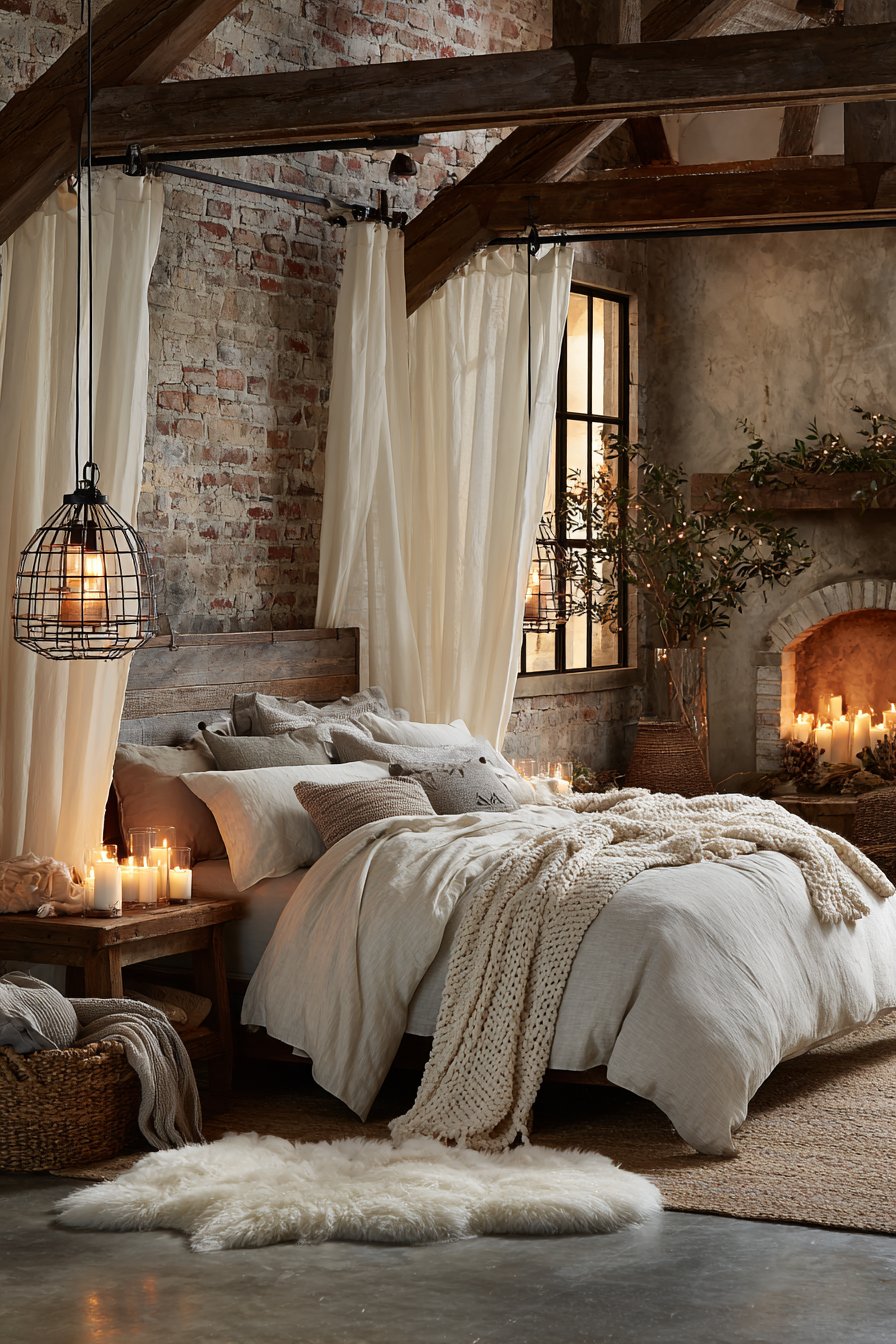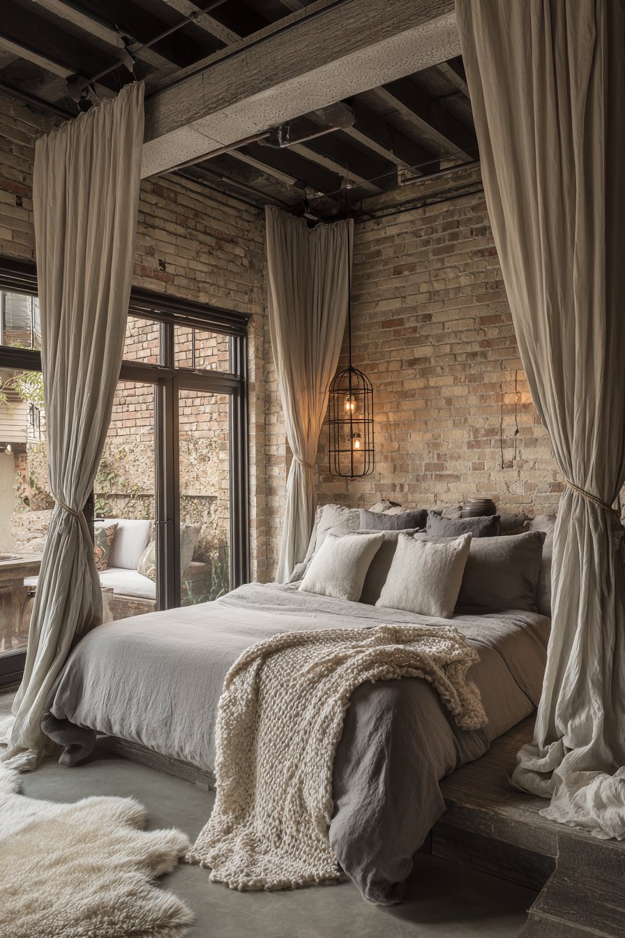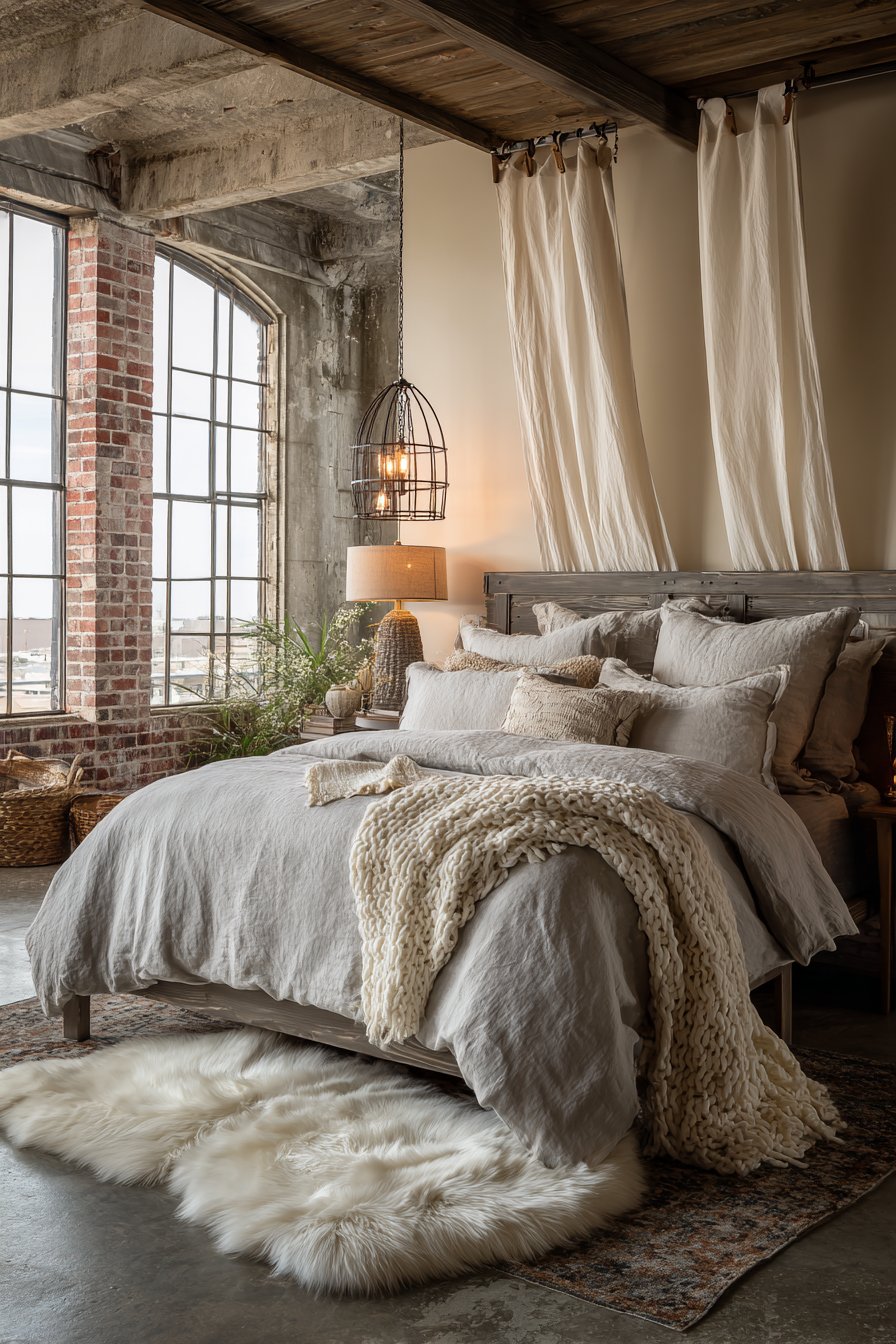 Exposed brick accent wall and concrete floors create modern rustic romance. These raw materials provide unexpected sophistication and urban edge. Sheepskin rugs soften the hard concrete surface underfoot. Natural light from steel-framed windows maintains the industrial aesthetic.