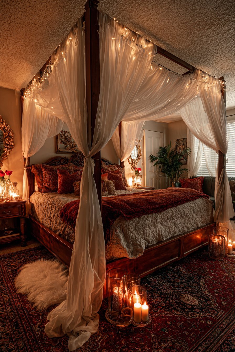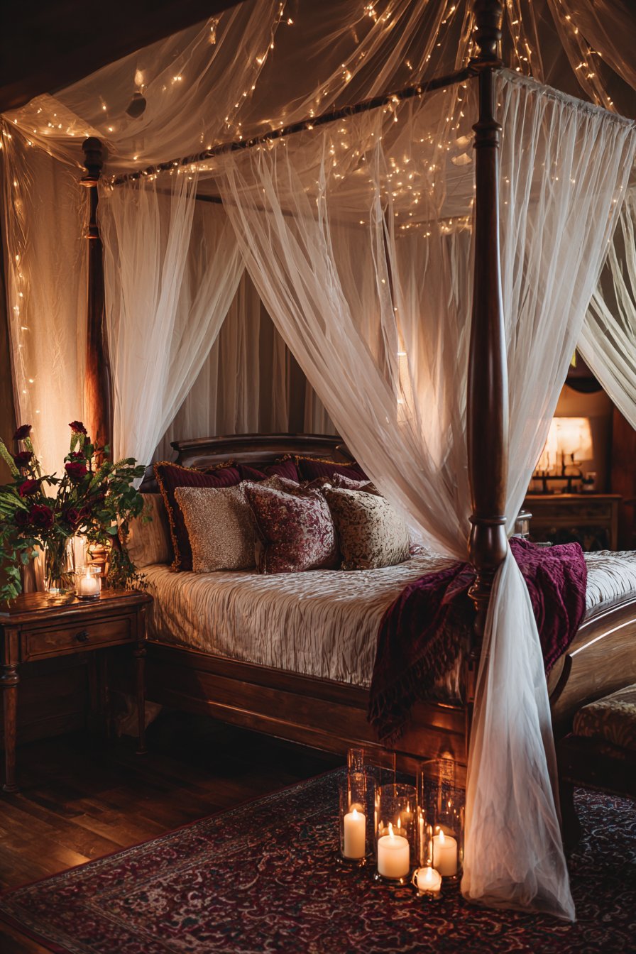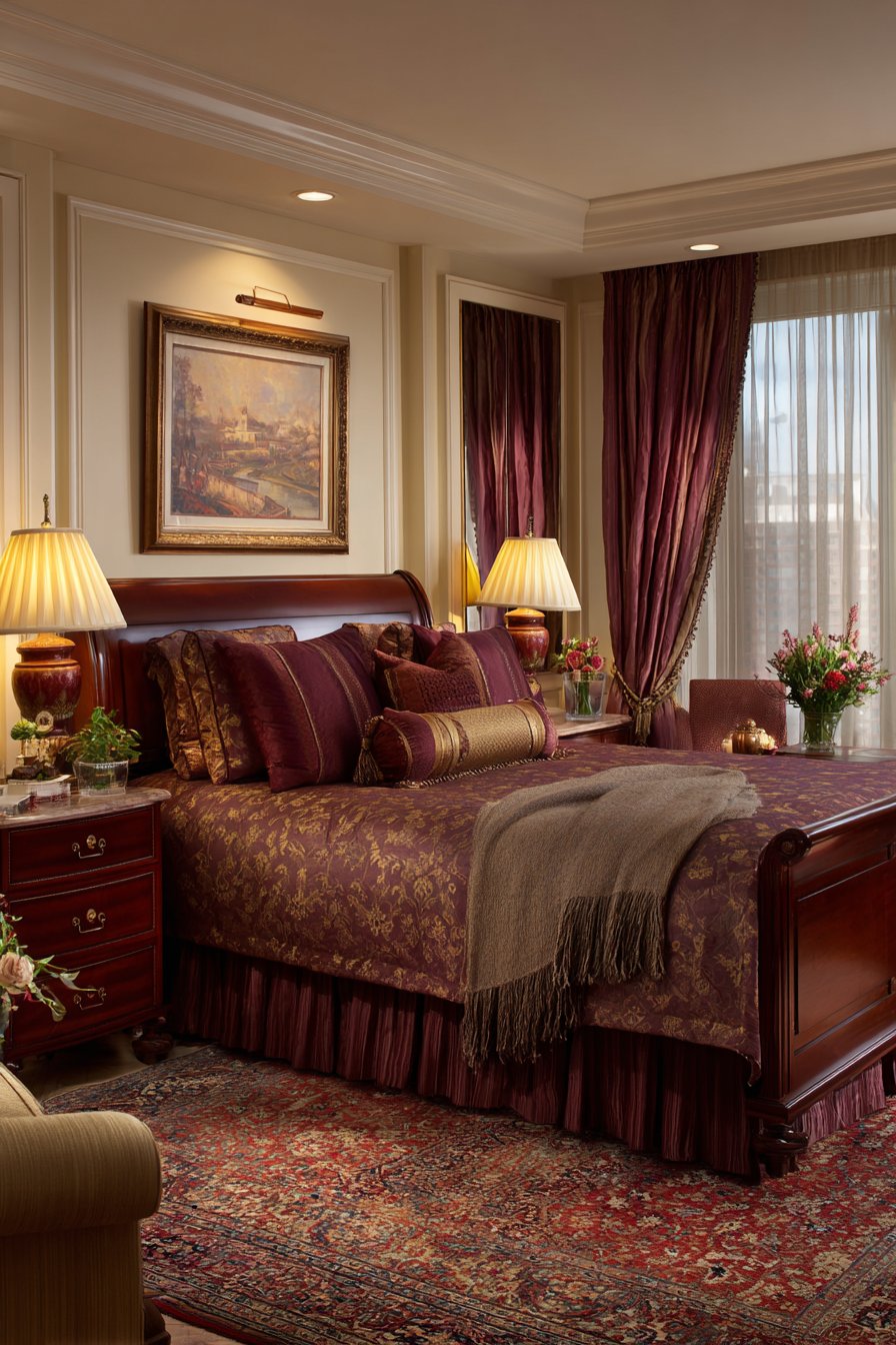 A plush area rug in deep burgundy grounds the space beneath the bed. This rich color choice adds warmth and sophistication. Nightstands display flickering pillar candles in mercury glass holders. Single stem roses in bud vases provide natural beauty and fragrance.