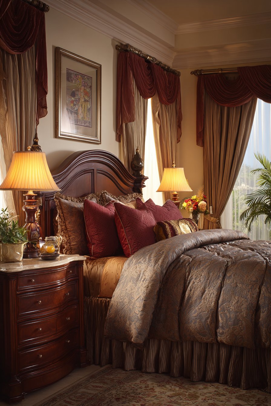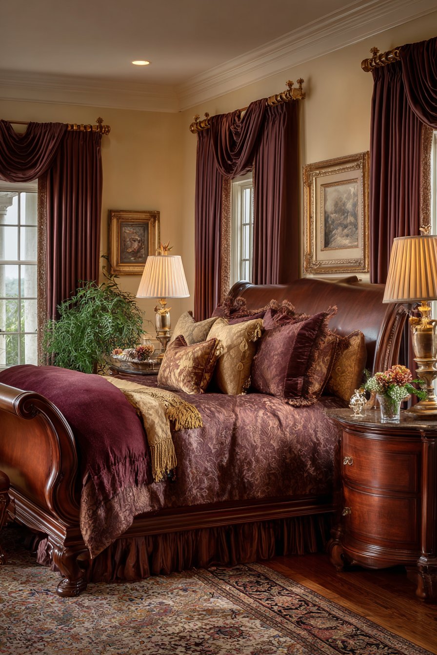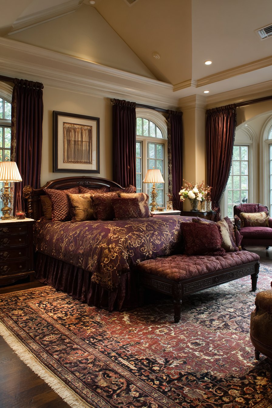 A plush area rug in deep burgundy grounds the space beneath the bed. This rich color choice adds warmth and sophistication. Nightstands display flickering pillar candles in mercury glass holders. Single stem roses in bud vases provide natural beauty and fragrance.