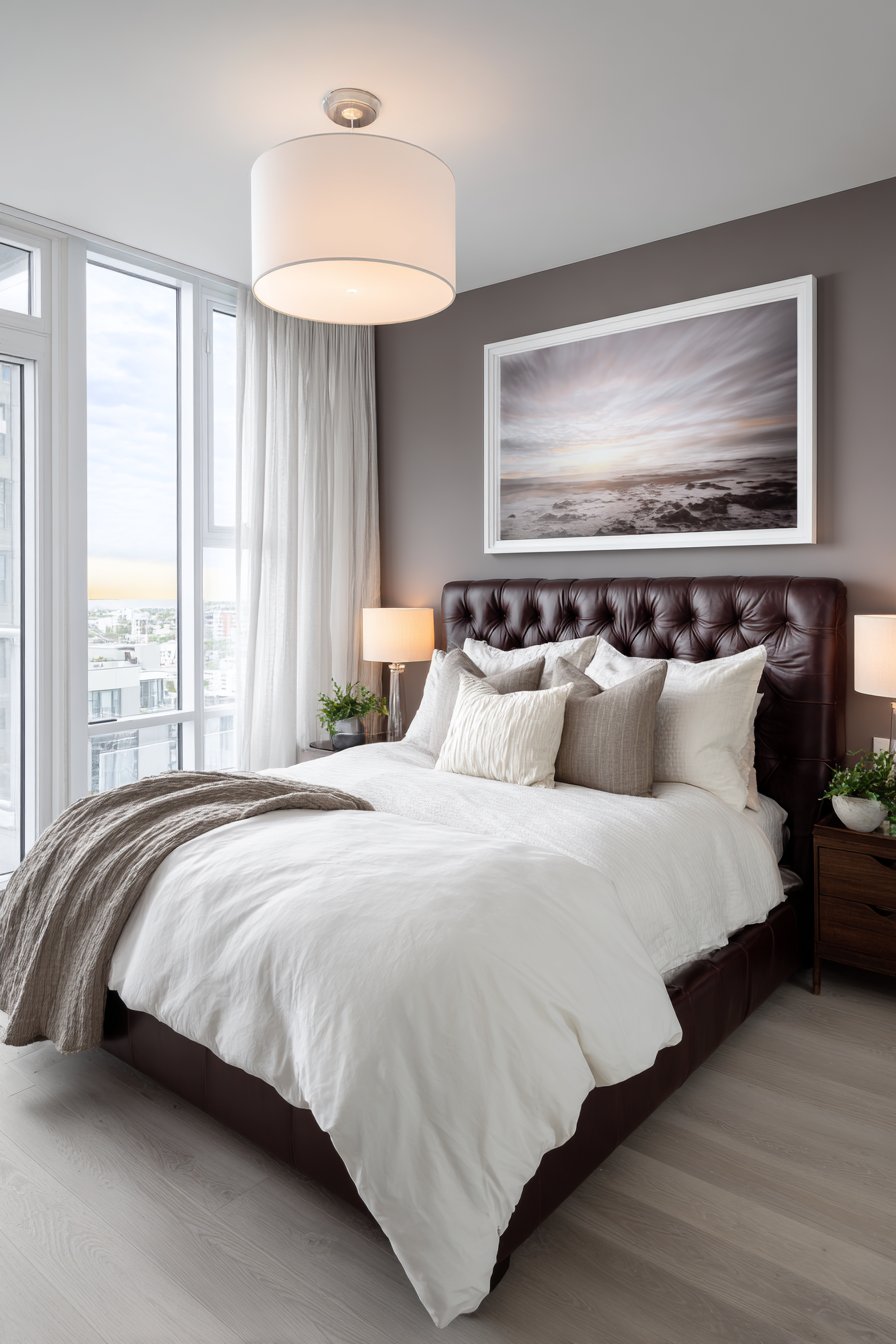 Evening interior design photography captures modern romantic simplicity effectively. Attention to leather texture and layered bedding creates visual interest. The neutral palette allows the quality materials to shine. This design proves that masculine materials create romantic atmosphere beautifully.