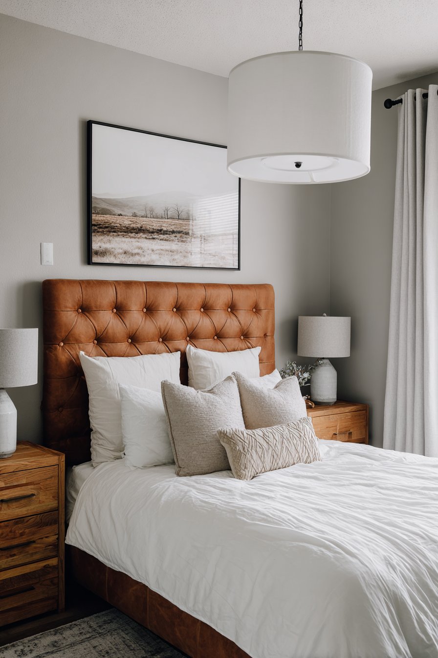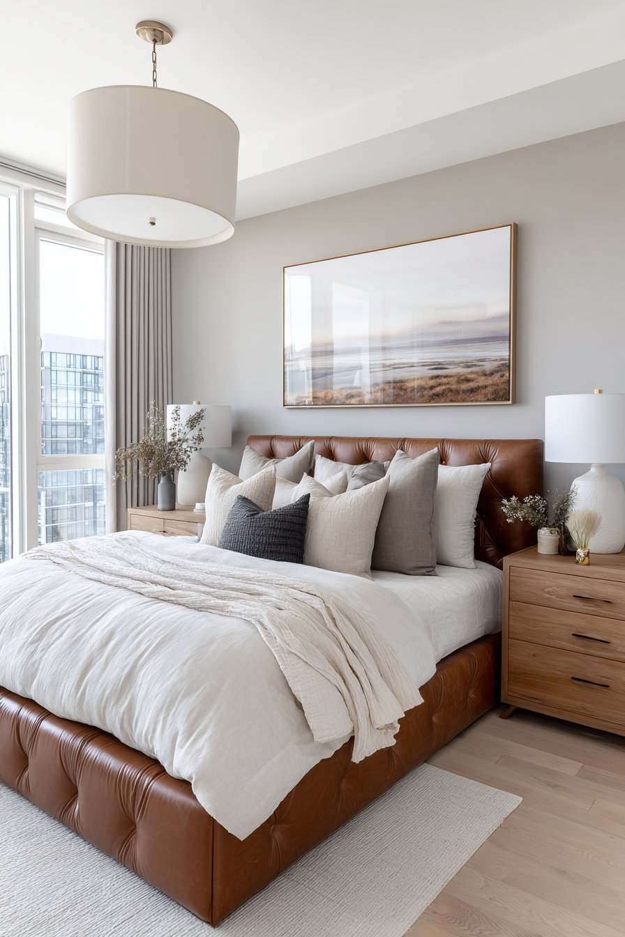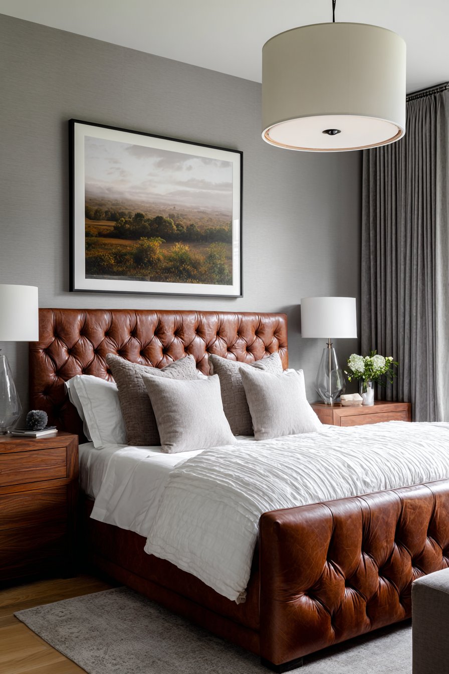 A tufted leather headboard in cognac brown creates a masculine romantic statement. The rich leather develops character and patina over time. White hotel bedding features subtle pin-tuck detailing for texture. Layers of textured neutral pillows add dimensional interest.