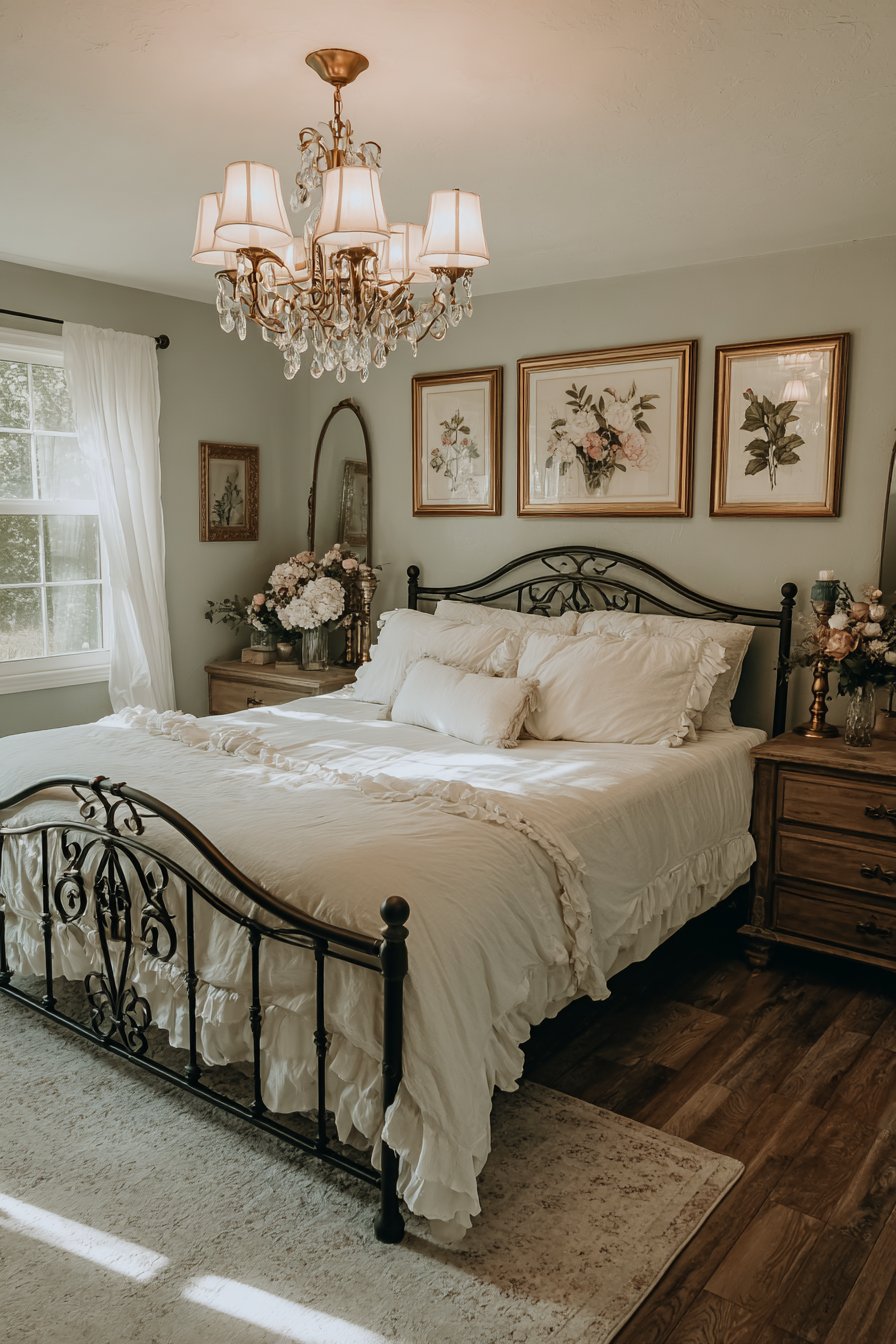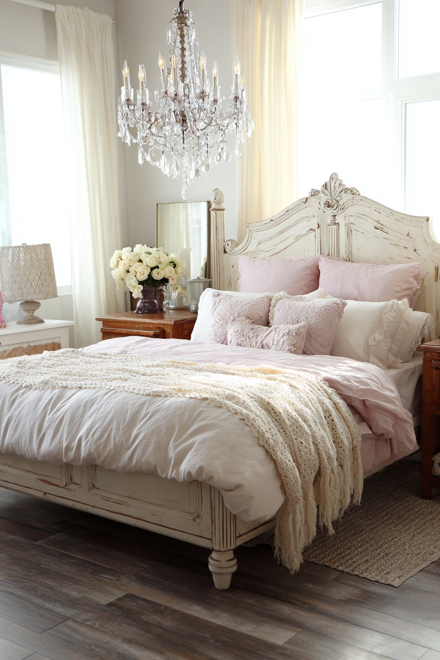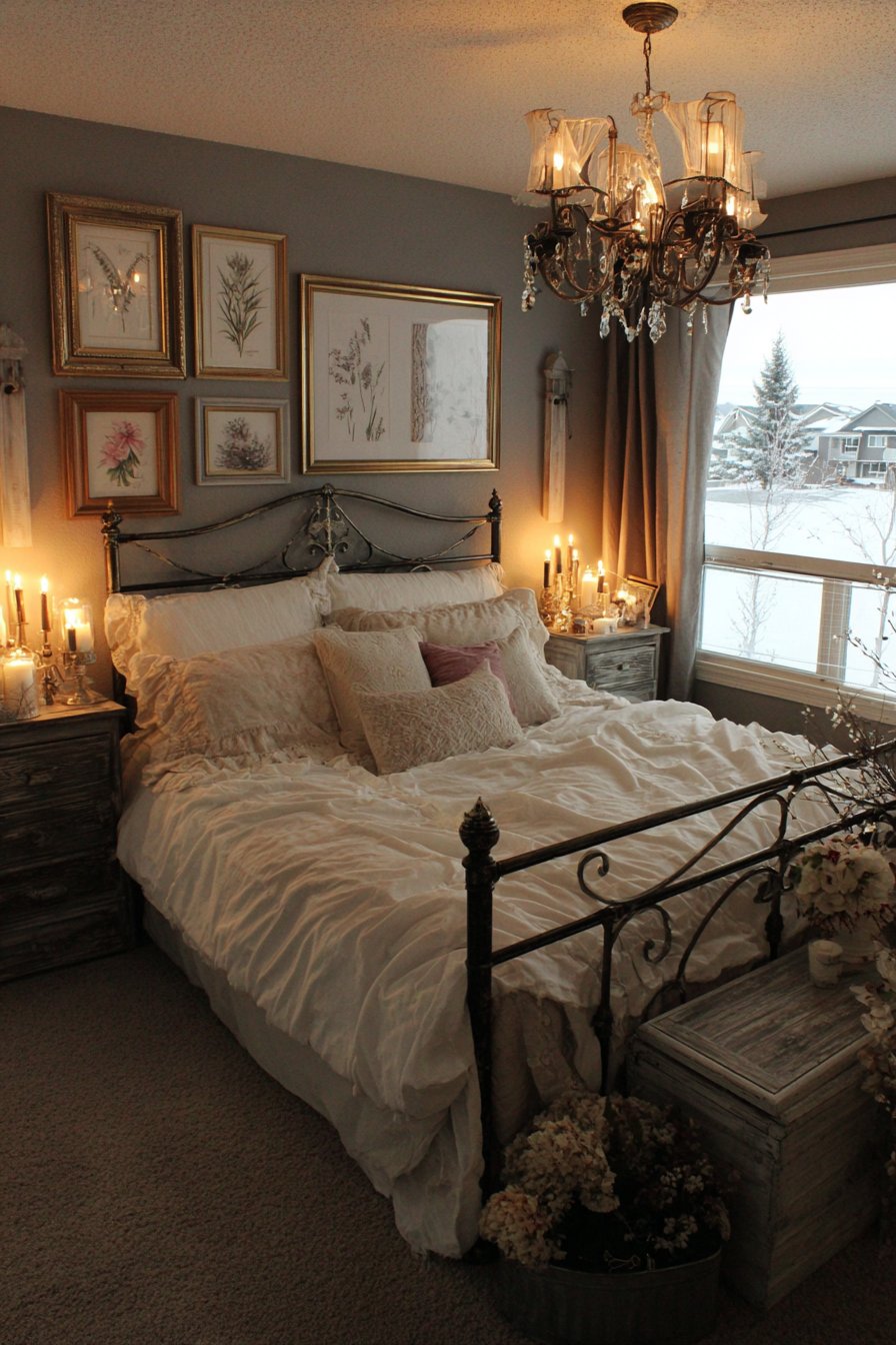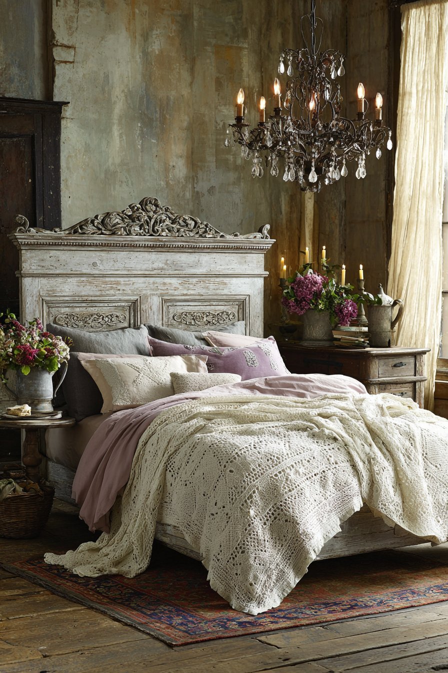 A vintage-inspired chandelier hangs centered above the bed gracefully. Fabric shades and crystal accents diffuse light beautifully. Weathered wood nightstands flank the bed with rustic charm. Antique brass candlesticks hold ivory taper candles on each surface.
