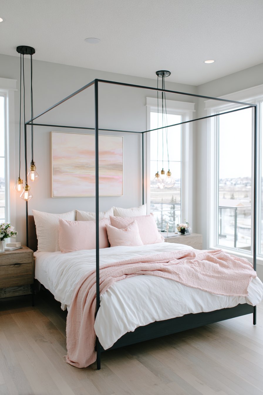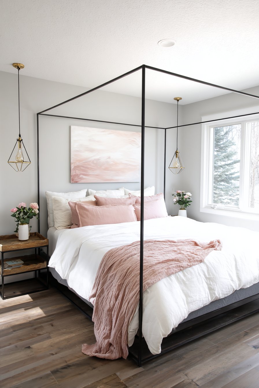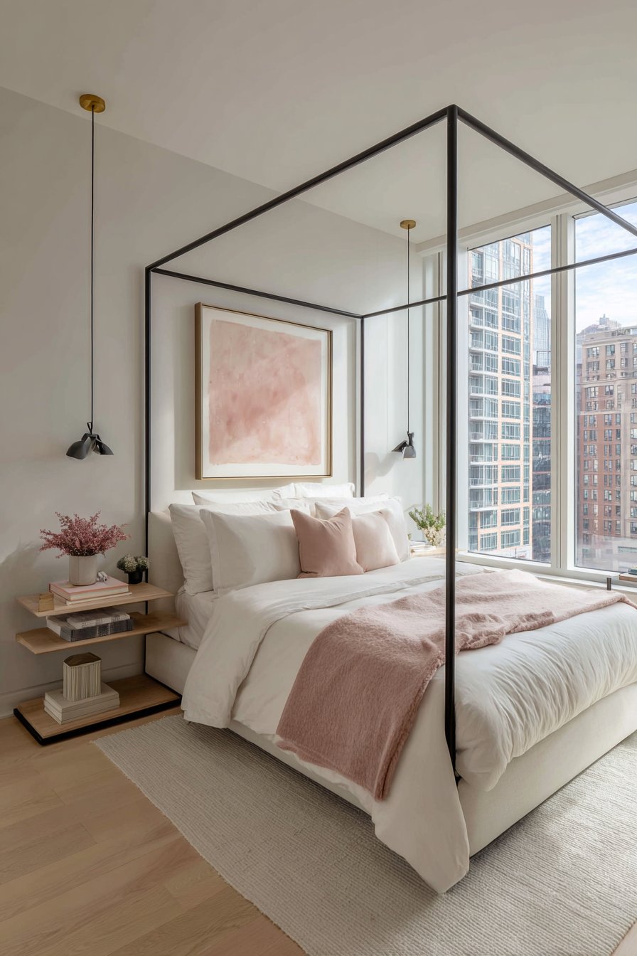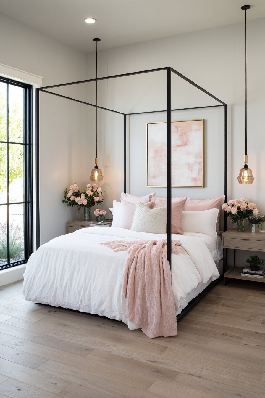 A modern four-poster bed features a slim black metal frame with minimal design. The clean lines create contemporary romantic structure. Crisp white cotton bedding provides fresh foundation. A single blush pink throw adds a focused color accent.