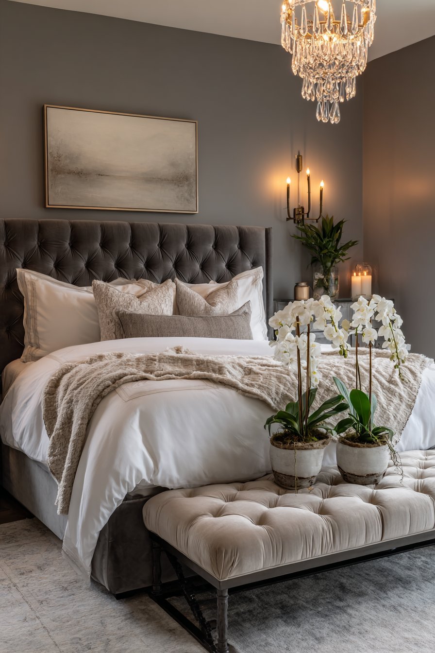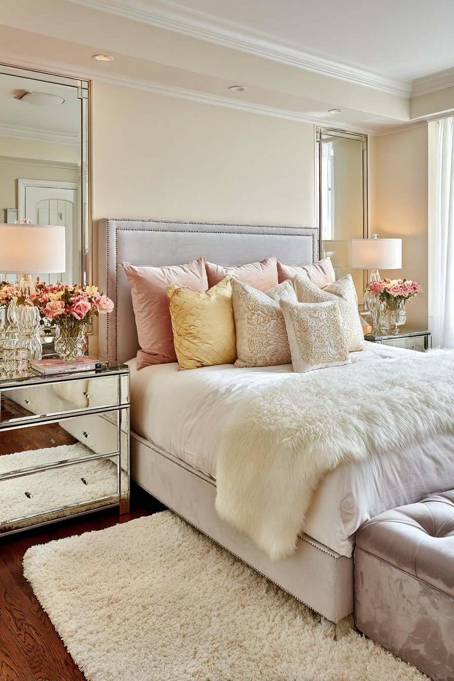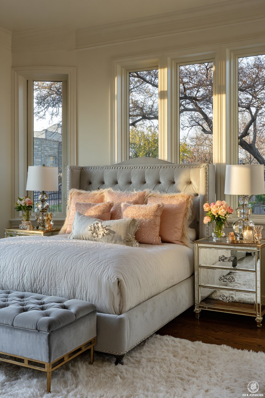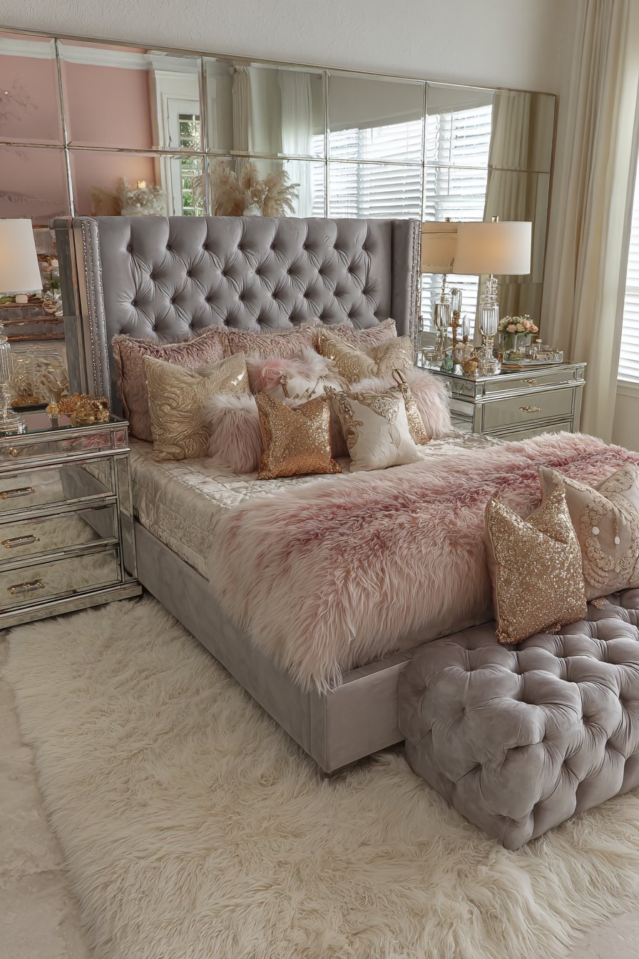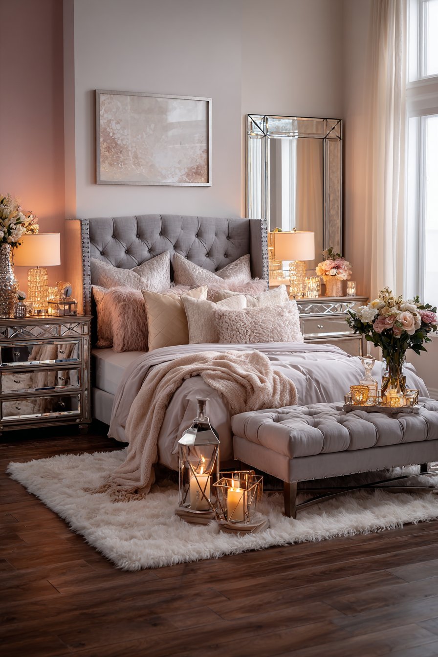 Mirrored three-drawer chests serve as nightstands reflecting bedside lamps beautifully. Crystal bases on the lamps add glamorous sparkle. A tufted ottoman at the foot of the bed matches the grey velvet. This provides functional seating while reinforcing the color palette.