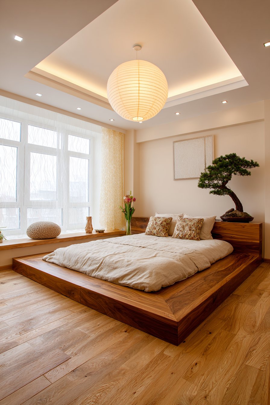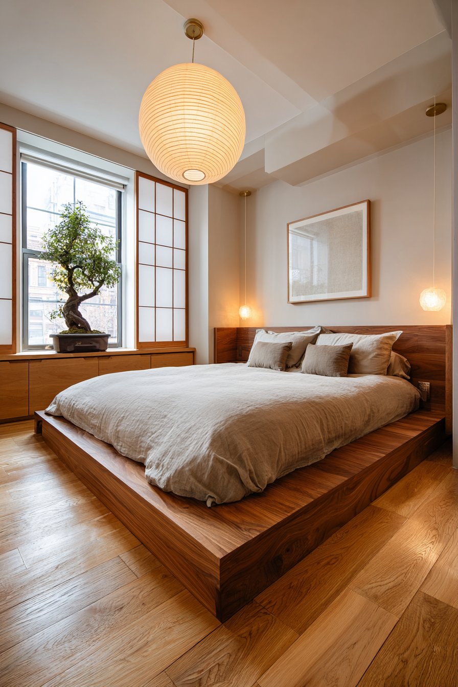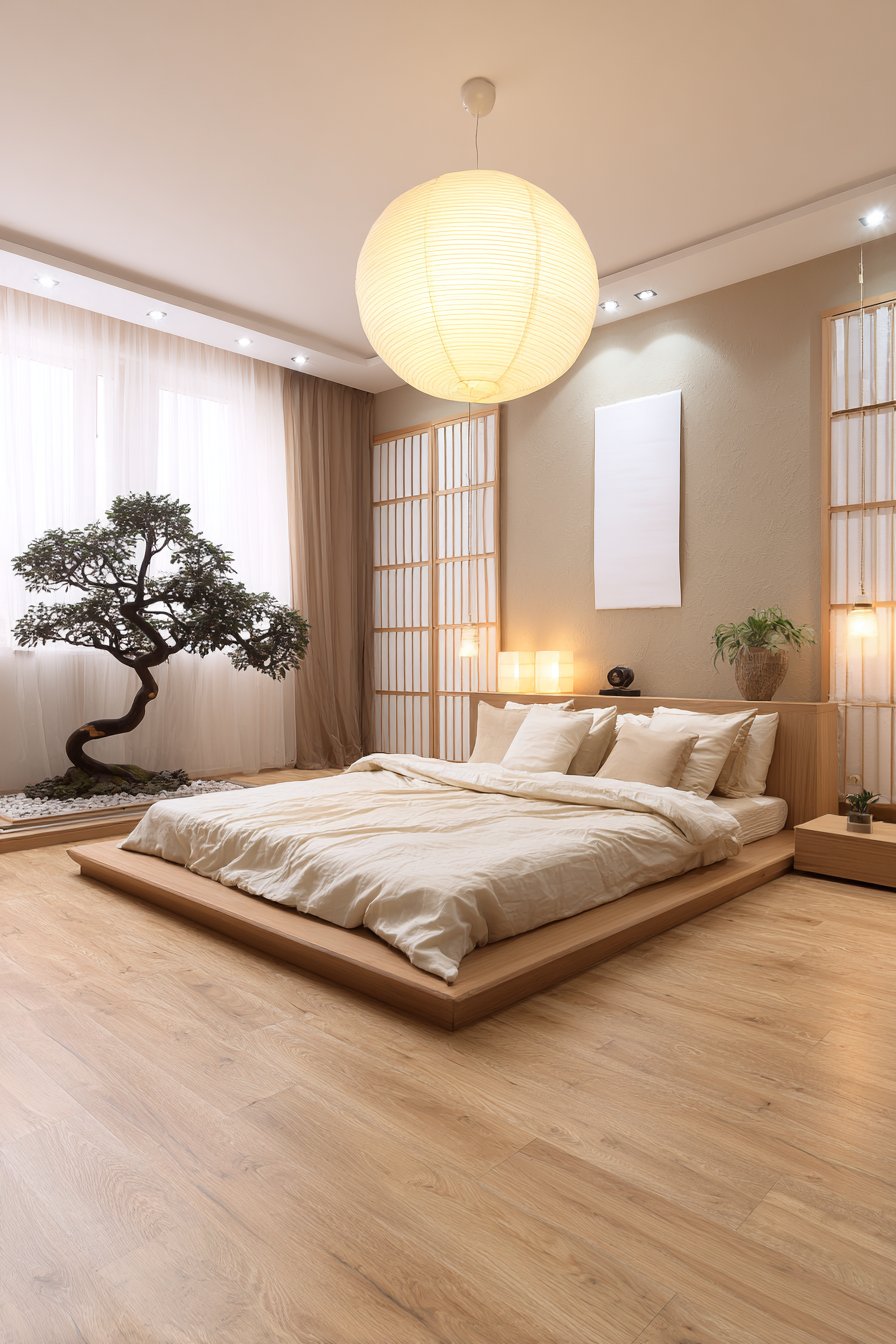 Shoji-style sliding panels serve as window treatments, diffusing natural light beautifully. The translucent panels maintain privacy while allowing brightness. A single bonsai tree on a floating shelf adds zen romantic element. The living sculpture provides focused natural beauty.