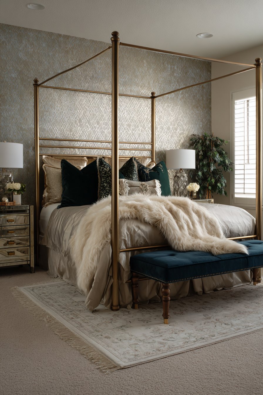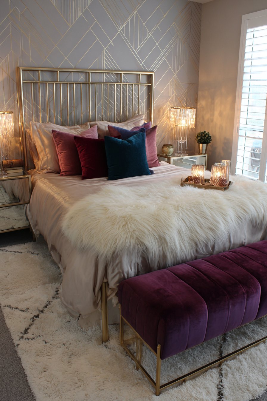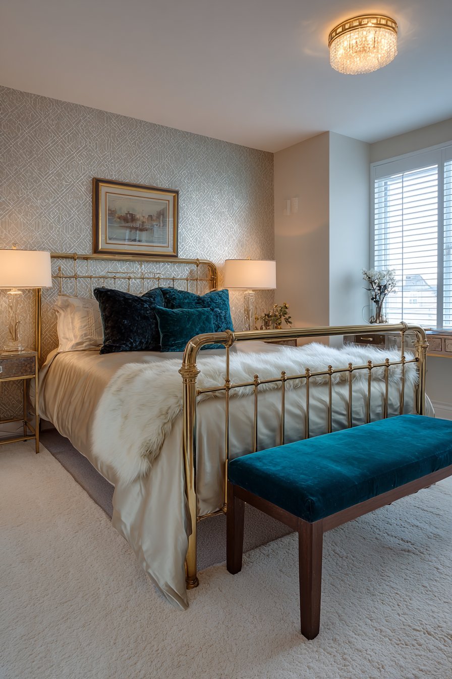 A velvet bench in jewel-tone sapphire sits at the foot of the bed. This provides functional seating with bold color impact. High-pile area rug in cream with geometric border grounds the design. Natural light through plantation shutters creates an adjustable ambiance.