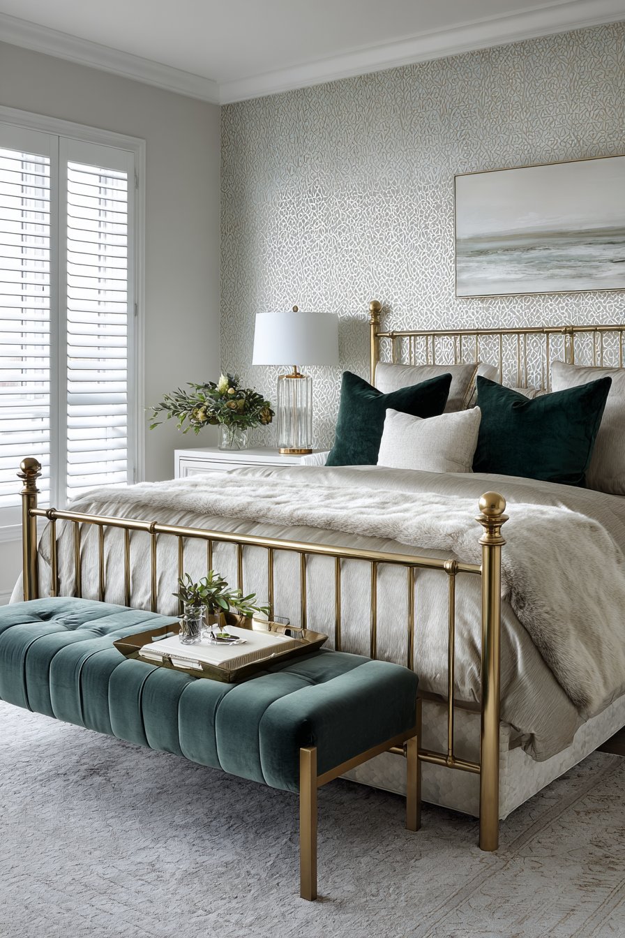 A brass bed frame features vertical spindle design with Art Deco character. The metallic finish adds warmth and glamorous shine. Luxurious bedding includes silk duvet in champagne color. Velvet pillows in emerald and navy add jewel-tone drama.
