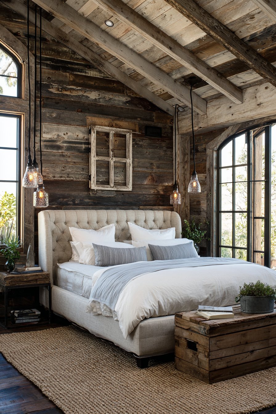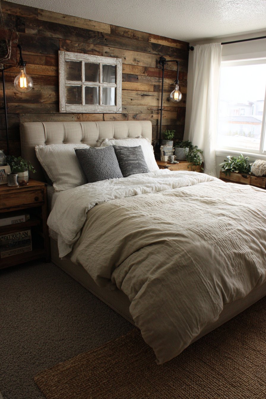 A reclaimed barn wood accent wall behind the bed features natural weathering and varied wood tones. Each board tells a story through its patina. An upholstered bed in oatmeal linen features simple horizontal channel tufting. The clean lines balance the rustic wood texture.