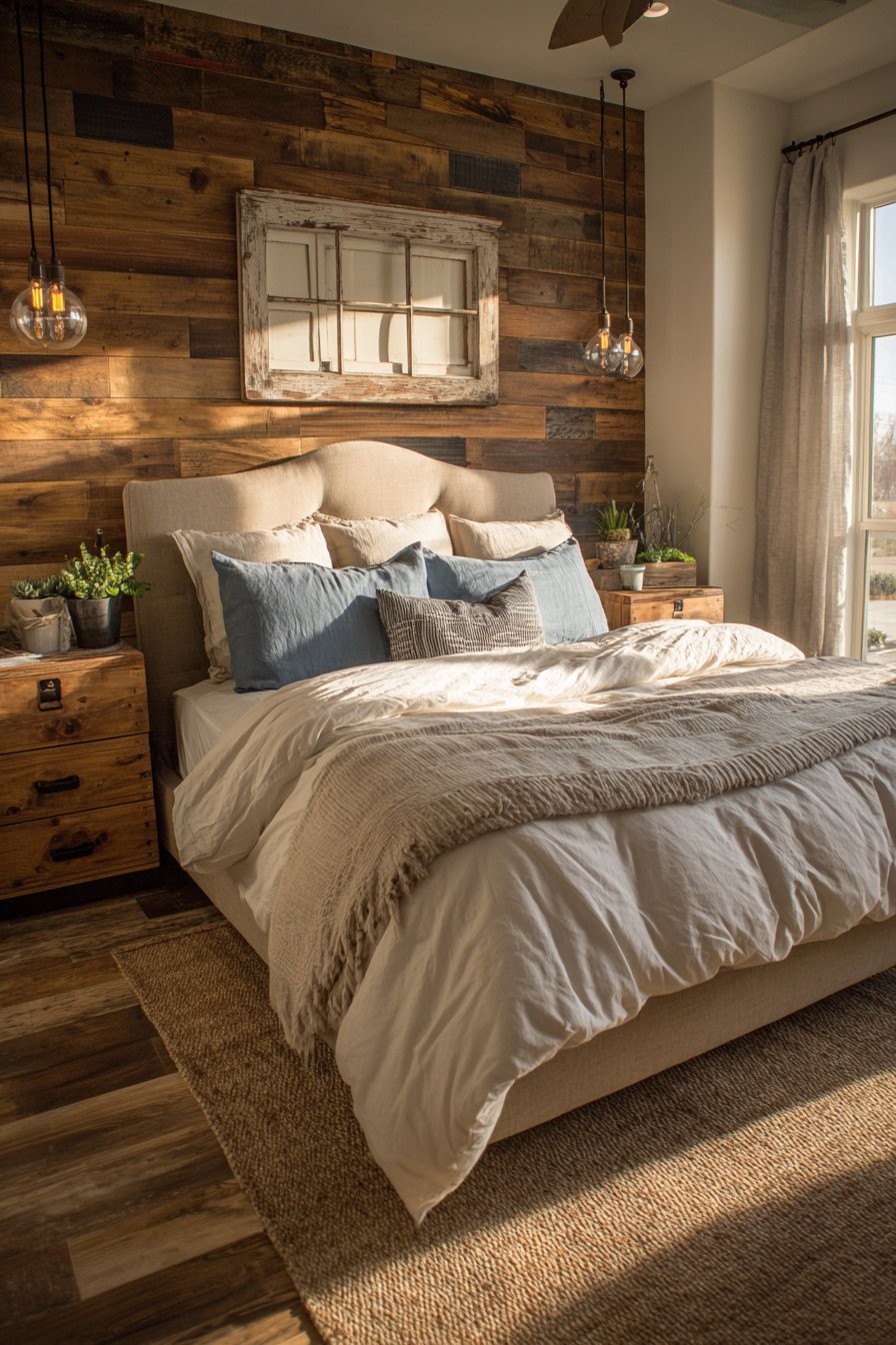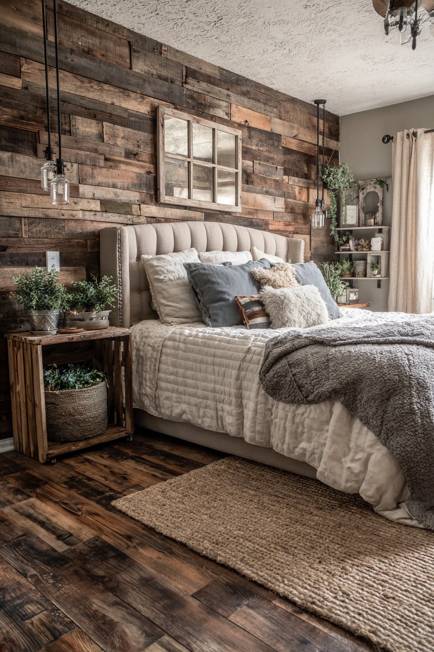 Mason jar pendant lights with Edison bulbs hang from black iron rods. These fixtures provide bedside lighting with farmhouse charm. Nightstands made from reclaimed crates hold succulents in galvanized containers. The repurposed materials add authentic vintage character.