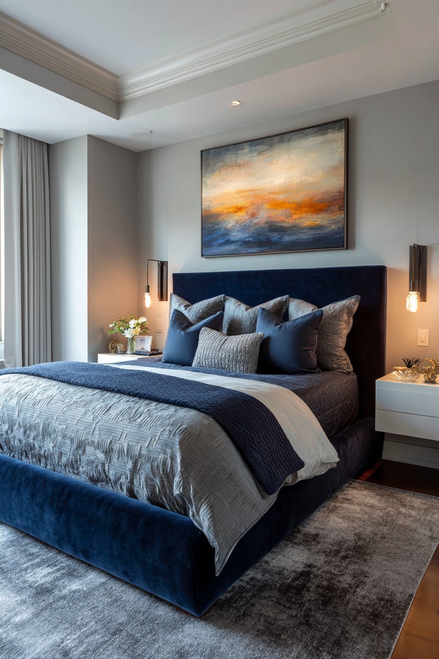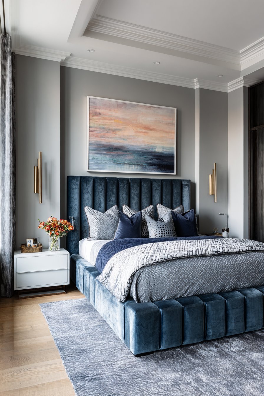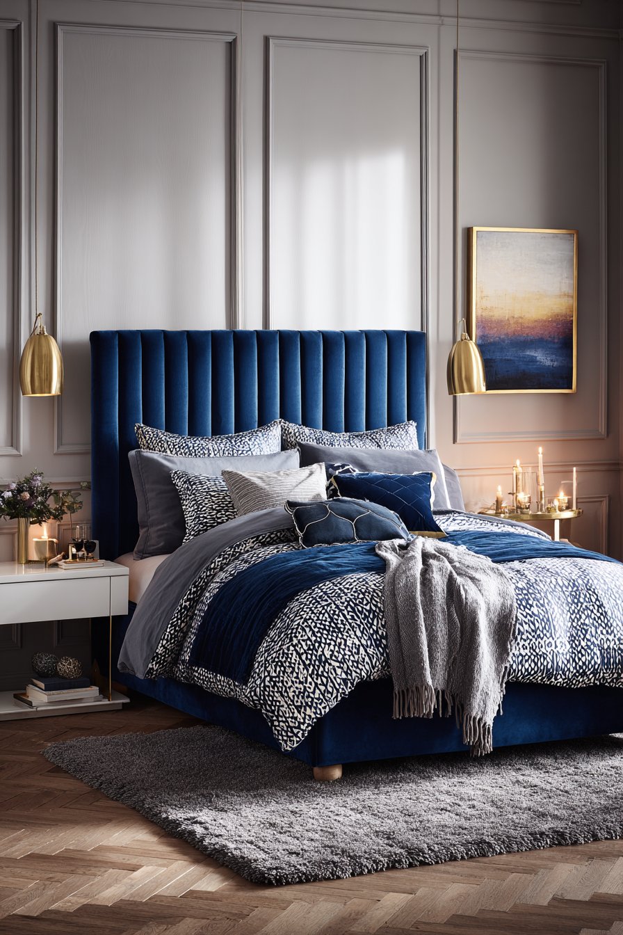 A sleek upholstered bed features a tall linear headboard in midnight blue velvet. The dramatic height creates strong architectural presence. Layered bedding in coordinating navy, grey, and white includes subtle geometric patterns. The pattern mixing adds visual complexity.
