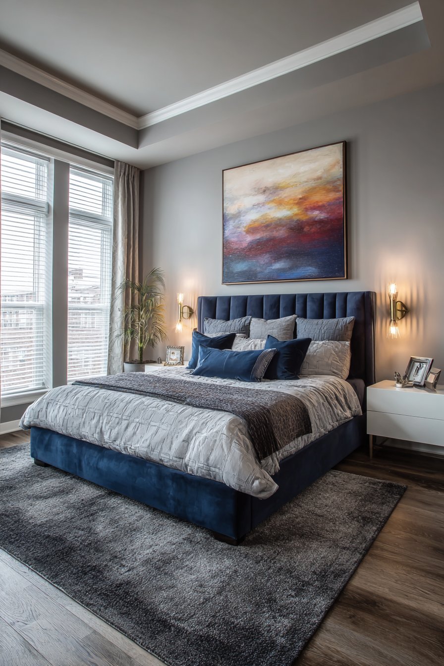 Large-scale abstract art in romantic sunset colors provides the main focal point. The warm tones soften the cool navy palette. Walls in soft dove grey with crown molding create sophisticated foundation. A plush area rug in deep charcoal grey over light oak flooring adds luxury.