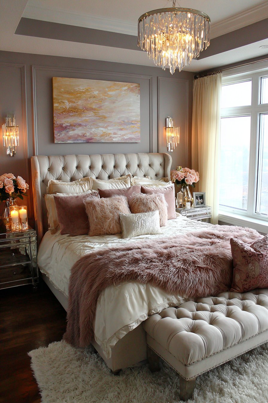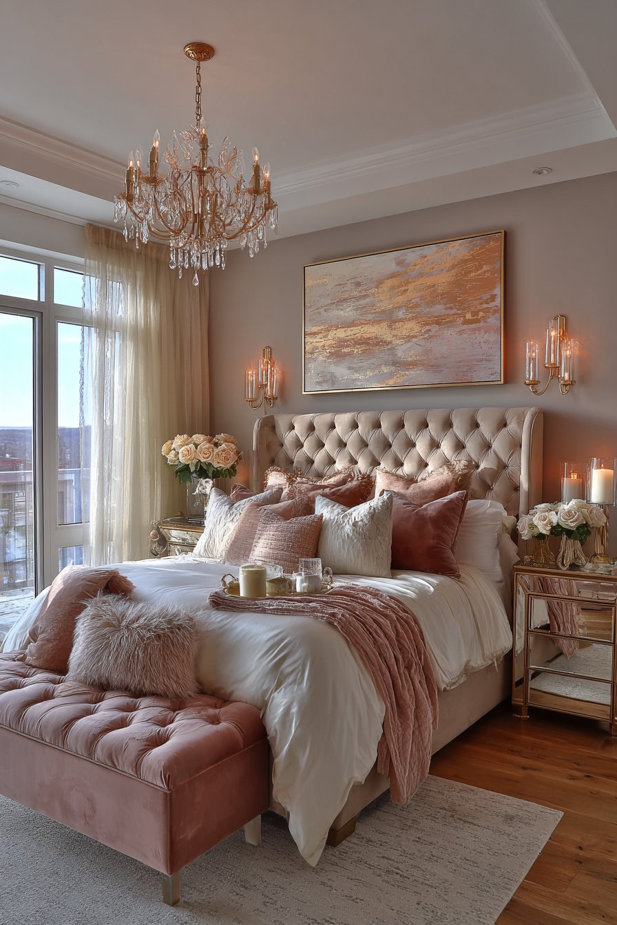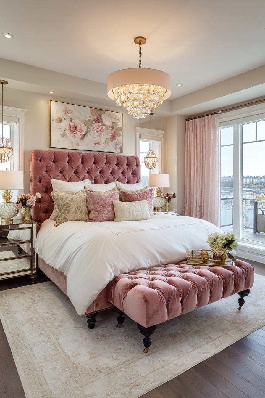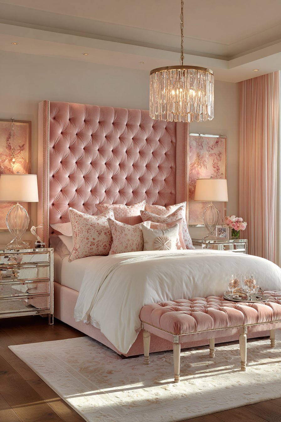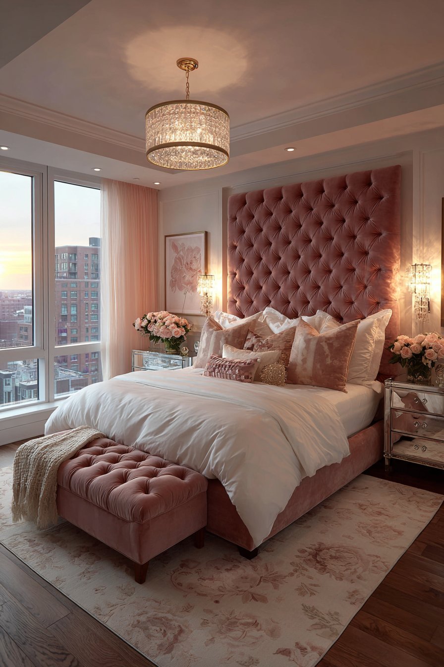 A crystal chandelier with fabric drum shade provides romantic overhead lighting. Coordinating crystal sconces flank the headboard creating layered illumination. A tufted bench at the foot of the bed matches the rose velvet. Mirrored nightstands with champagne gold hardware reflect soft lamplight.