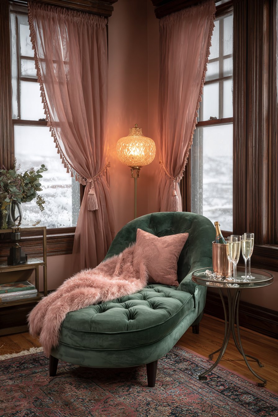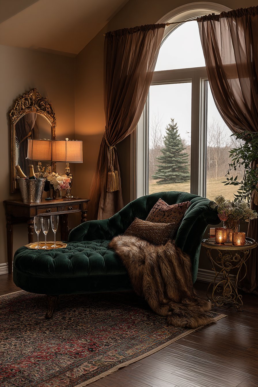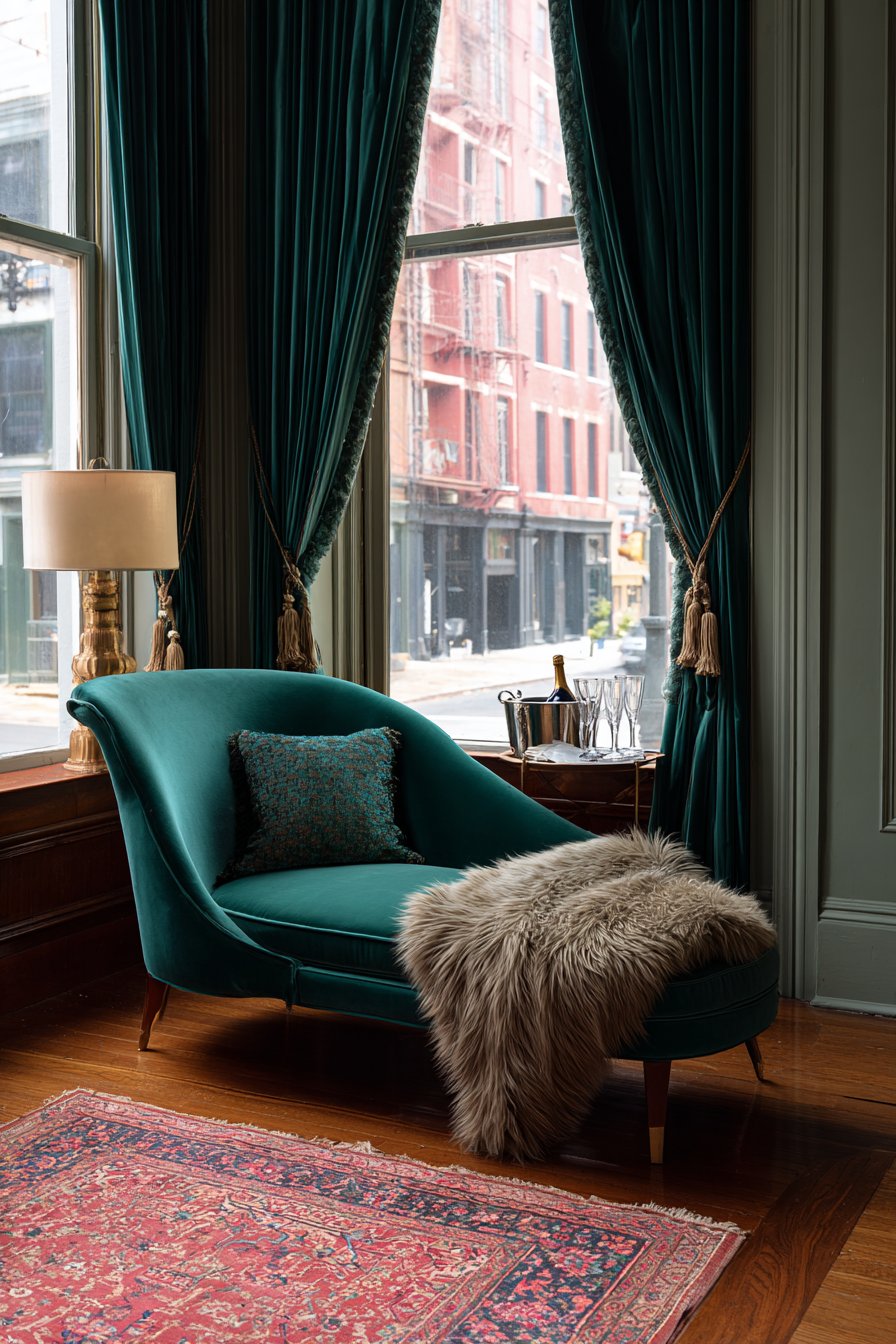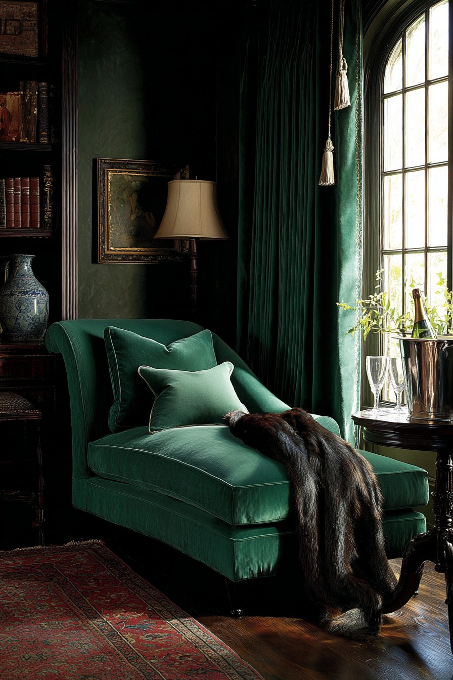 An intimate reading nook features a velvet chaise lounge in rich emerald tones. The jewel-tone upholstery makes a bold yet romantic statement. Positioned near a tall window, the chaise captures natural evening light. Heavy silk drapes frame the window with tasseled cord tiebacks.