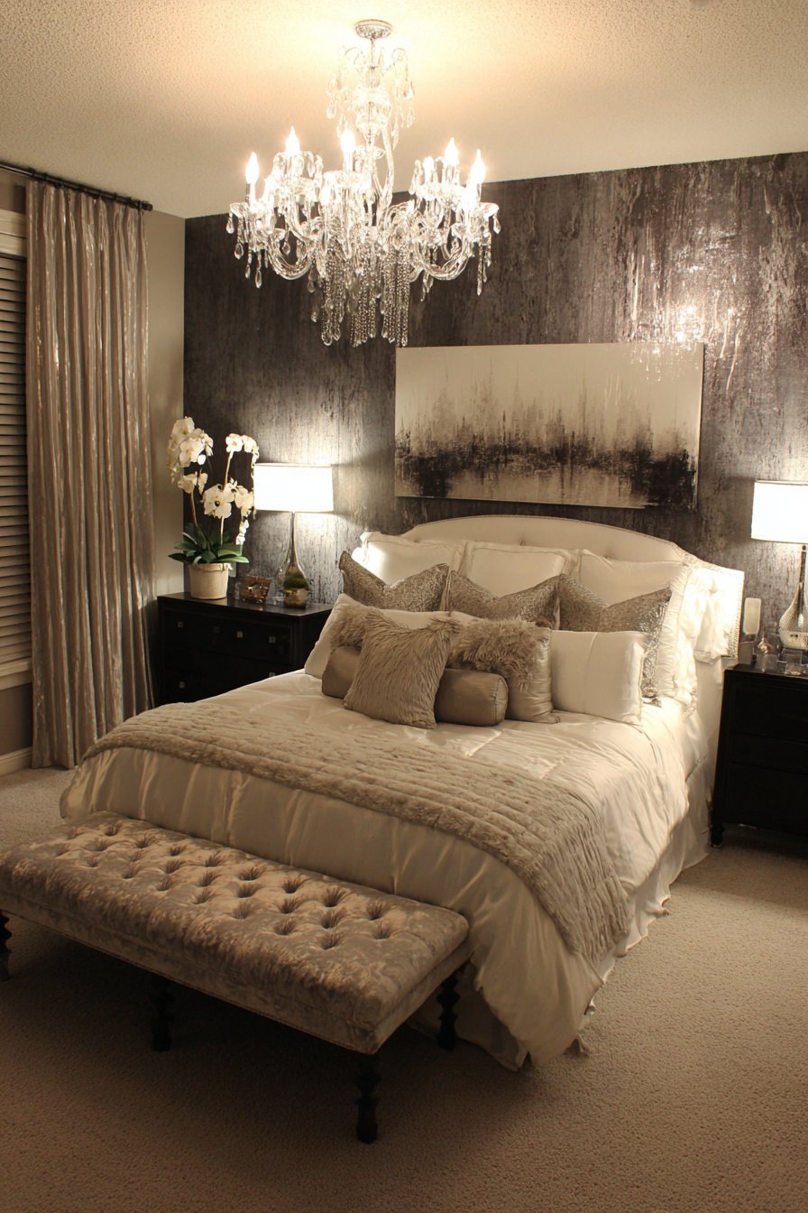A matching crystal chandelier provides soft overhead lighting from the center. Coordinating wall sconces create an intimate reading light on both sides. The layered lighting approach offers flexibility for different moods. Tufted bench at the foot of the bed adds functional seating.