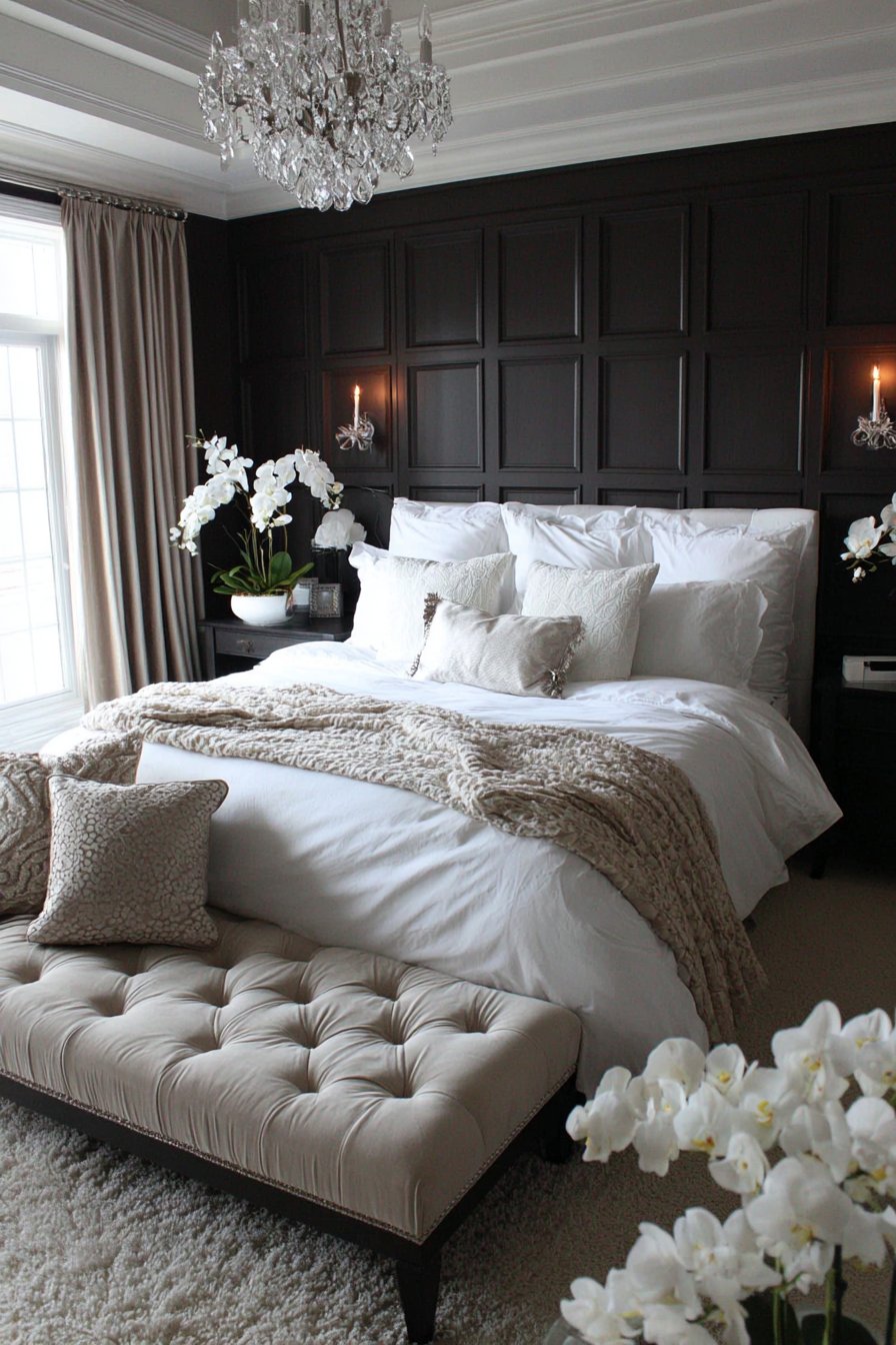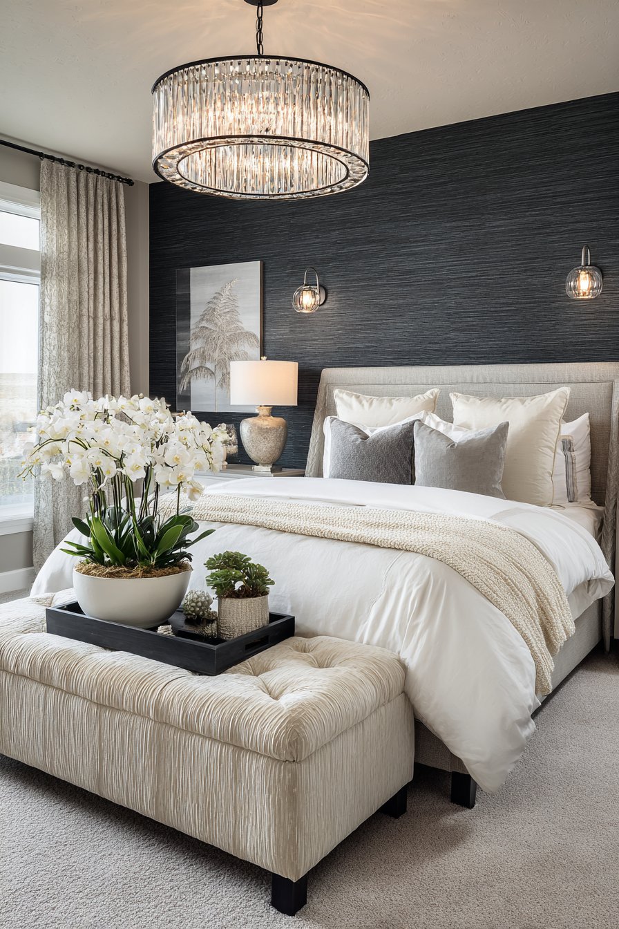 A statement wall in deep charcoal grey creates dramatic impact behind the bed. This bold color choice contrasts beautifully with crisp white hotel-quality bedding. Layers of textured throws in cream and taupe add dimensional interest. The monochromatic palette feels sophisticated and contemporary.