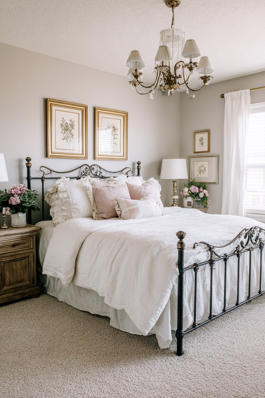 White cotton bedding with chambray blue accent pillows maintains fresh simplicity. A jute area rug over wide-plank pine flooring adds natural texture. A vintage window frame repurposed as wall decor adds architectural interest. These collected elements create personal romantic style.