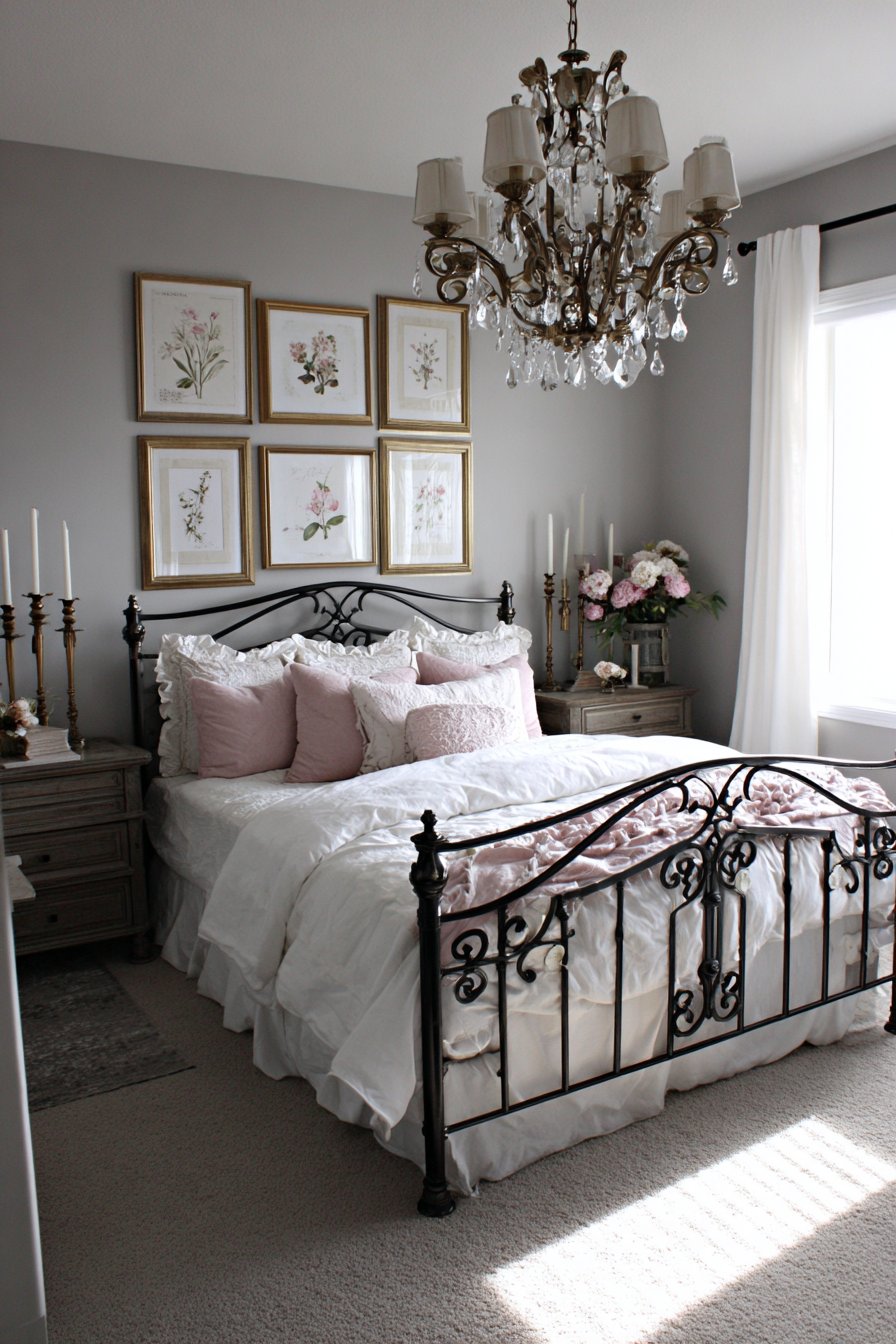 Natural window light mixes with candlelight to create romantic glow. Professional interior photography captures the vintage romantic aesthetic perfectly. Attention to metalwork details showcases the craftsmanship involved. Layered textures throughout make the space feel collected and personalized over time.