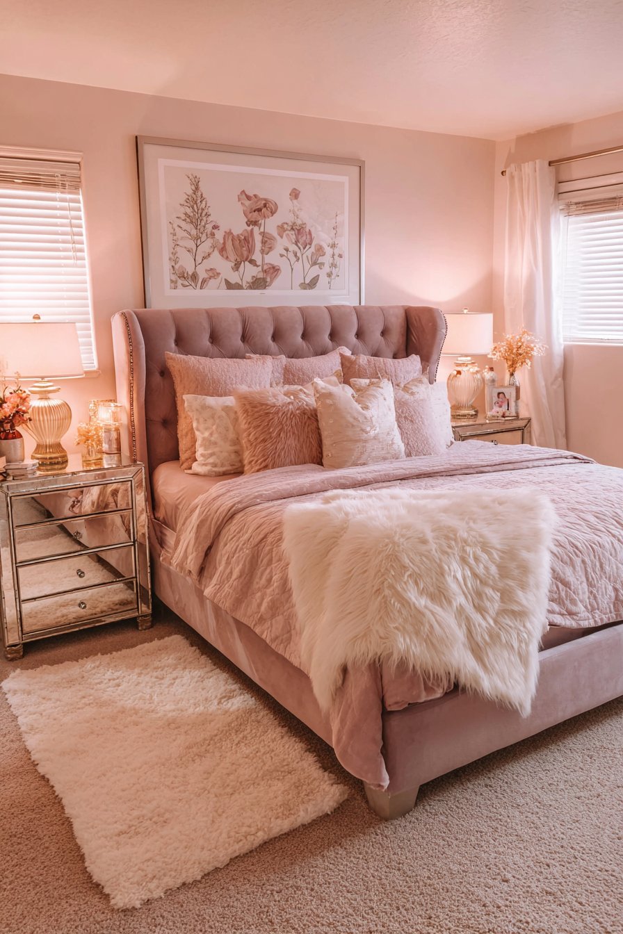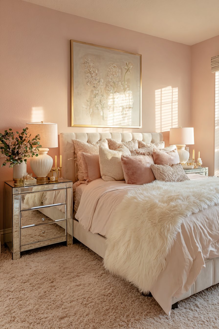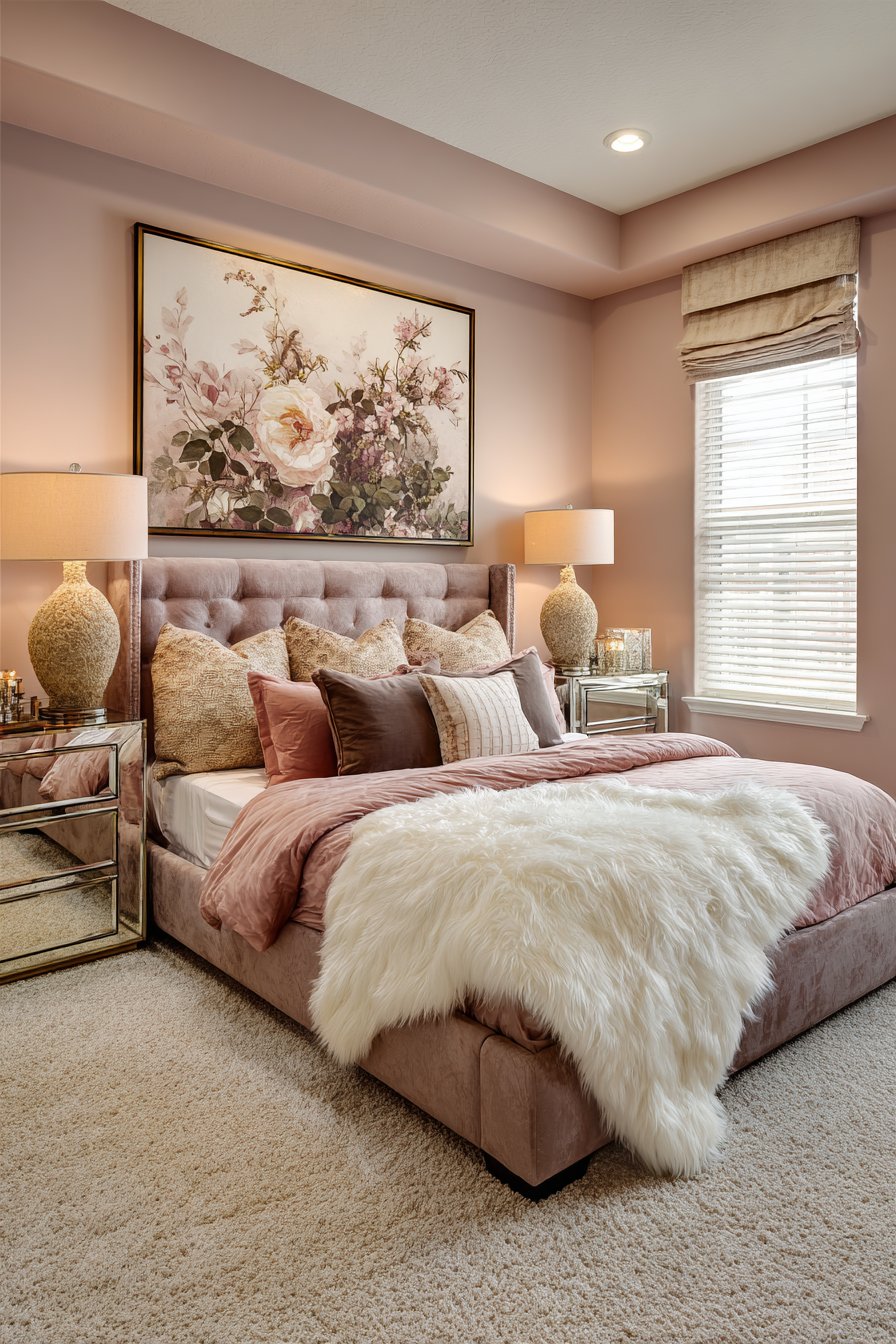 Large framed botanical artwork above the bed provides a strong focal point. The natural subject matter balances the glamorous decorative elements. Pale pink walls and plush cream carpet create a soft romantic foundation. These light surfaces maximize the reflected light throughout.