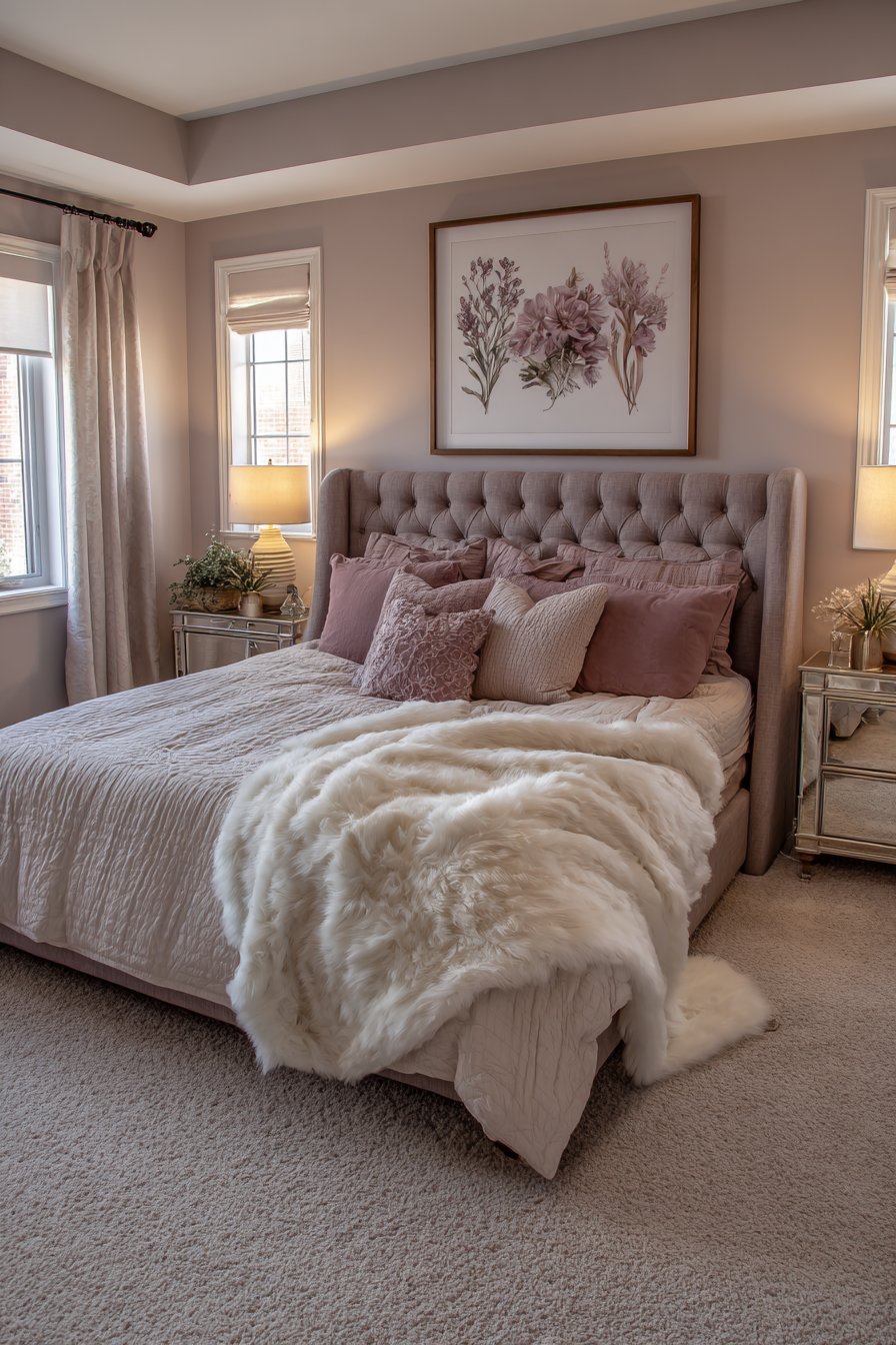 An upholstered wingback bed in dusty mauve linen commands attention beautifully. Multiple pillow layers in complementary rose and cream tones invite relaxation. The coordinated color palette creates cohesive visual flow. Mirrored nightstands with beveled edges add glamorous reflective surfaces.