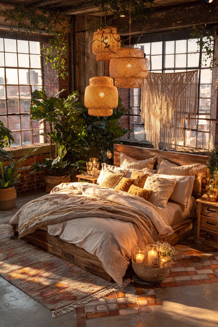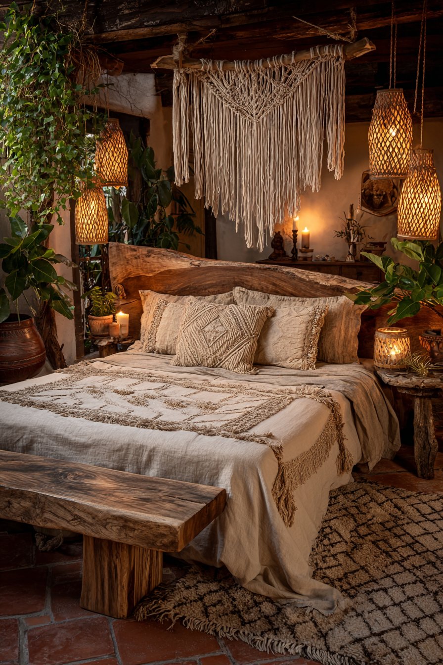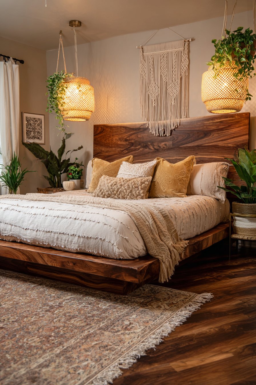 Woven pendant lights with natural fiber shades hang at different heights. This staggered placement creates visual rhythm and ambient mood lighting. The natural materials complement the wood headboard beautifully. Macramé wall hanging adds bohemian romantic texture above the headboard.