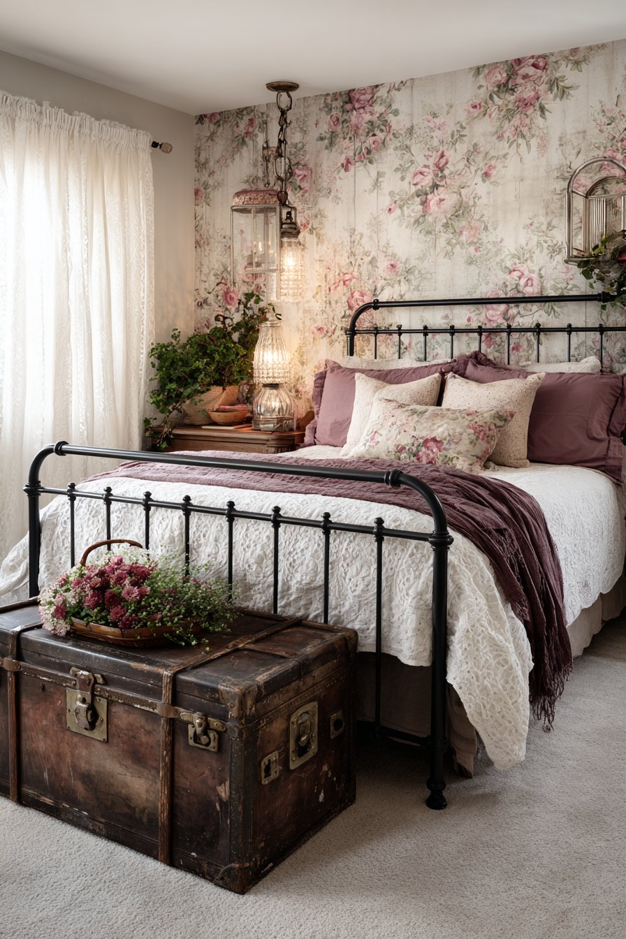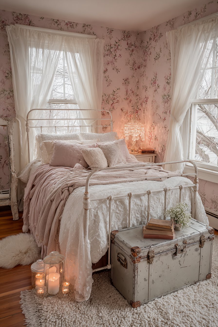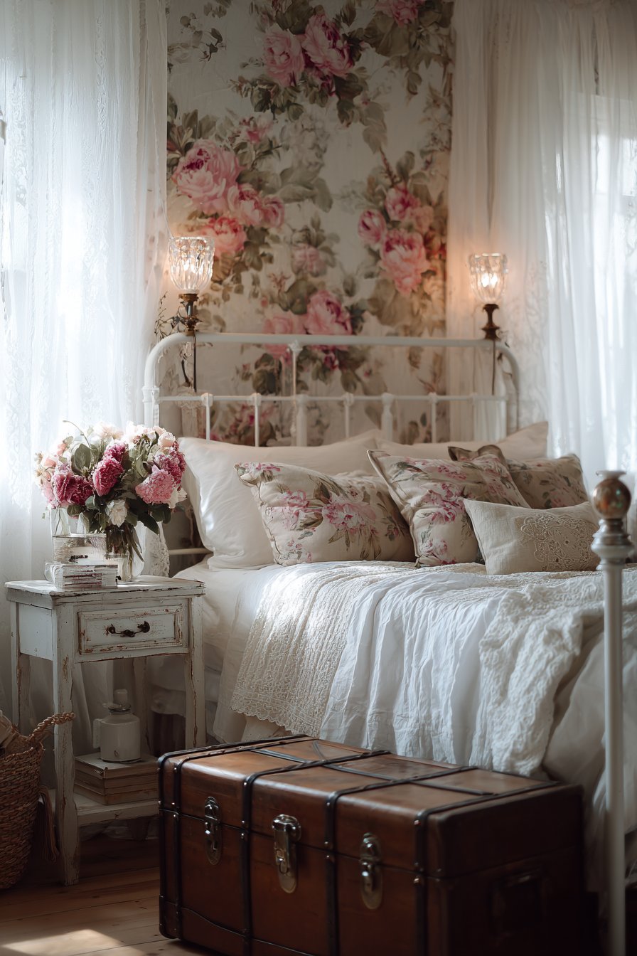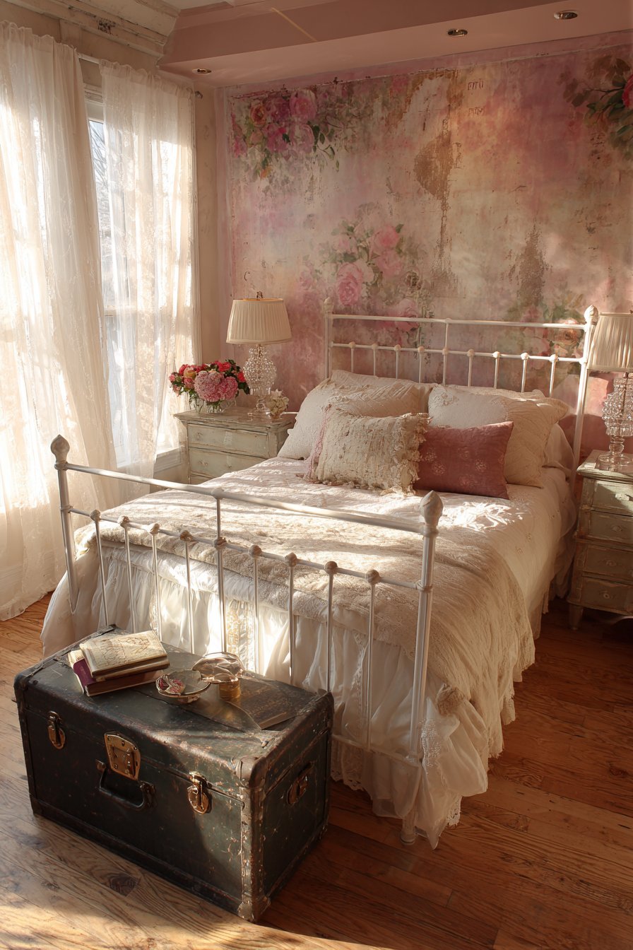 Sheer lace curtains diffuse natural light beautifully throughout the day. The delicate fabric maintains privacy while allowing brightness. A vintage trunk at the foot of the bed adds functional romantic charm. This piece provides extra storage while reinforcing the vintage aesthetic.