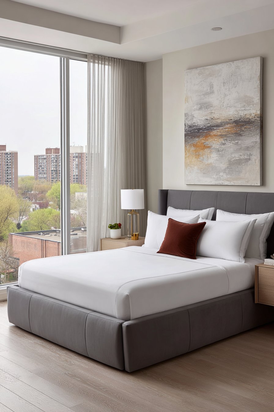 Professional interior photography with balanced exposure captures contemporary romantic minimalism. The restrained design demonstrates that less creates more romantic impact. Natural light fills the space, creating airy brightness. This bedroom proves minimalism and romance coexist beautifully.