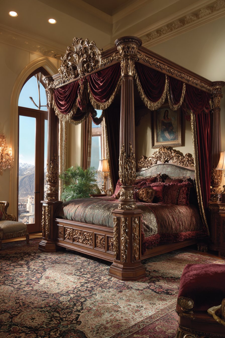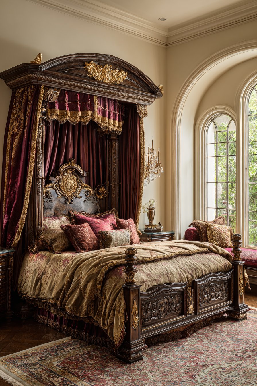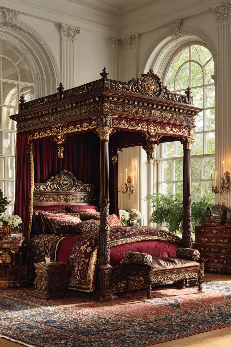 A magnificent four-poster bed commands attention in this royal bedroom. Hand-carved walnut posts feature intricate detailing throughout. Gold leaf accents highlight the woodwork’s artisanal craftsmanship. The posts rise majestically, defining the sleeping area within the larger room.