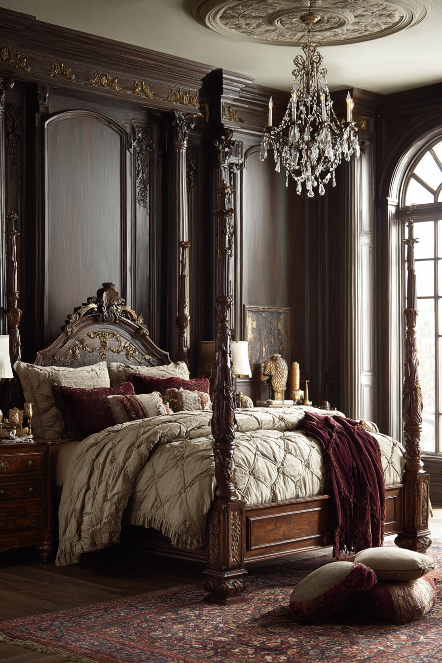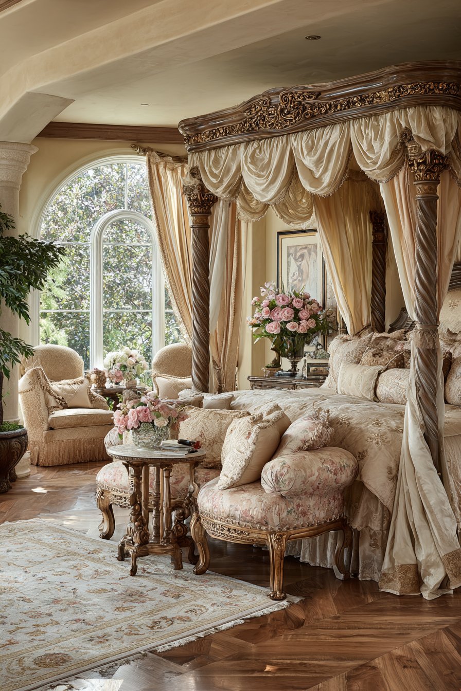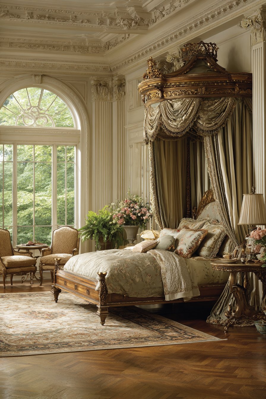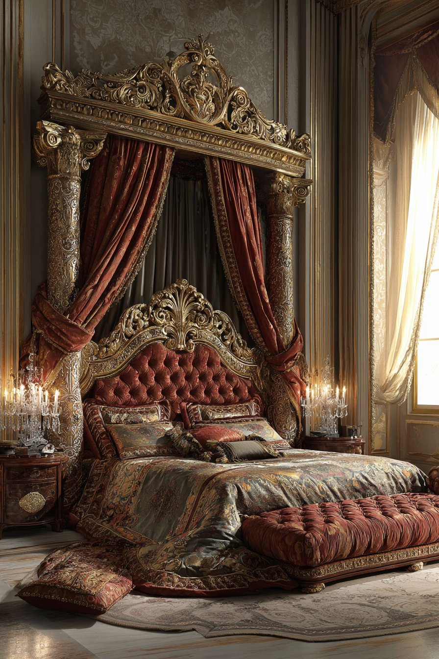 A magnificent four-poster bed commands attention in this royal bedroom. Hand-carved walnut posts feature intricate detailing throughout. Gold leaf accents highlight the woodwork’s artisanal craftsmanship. The posts rise majestically, defining the sleeping area within the larger room.