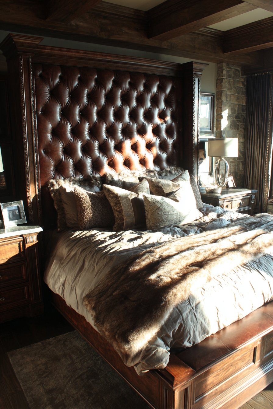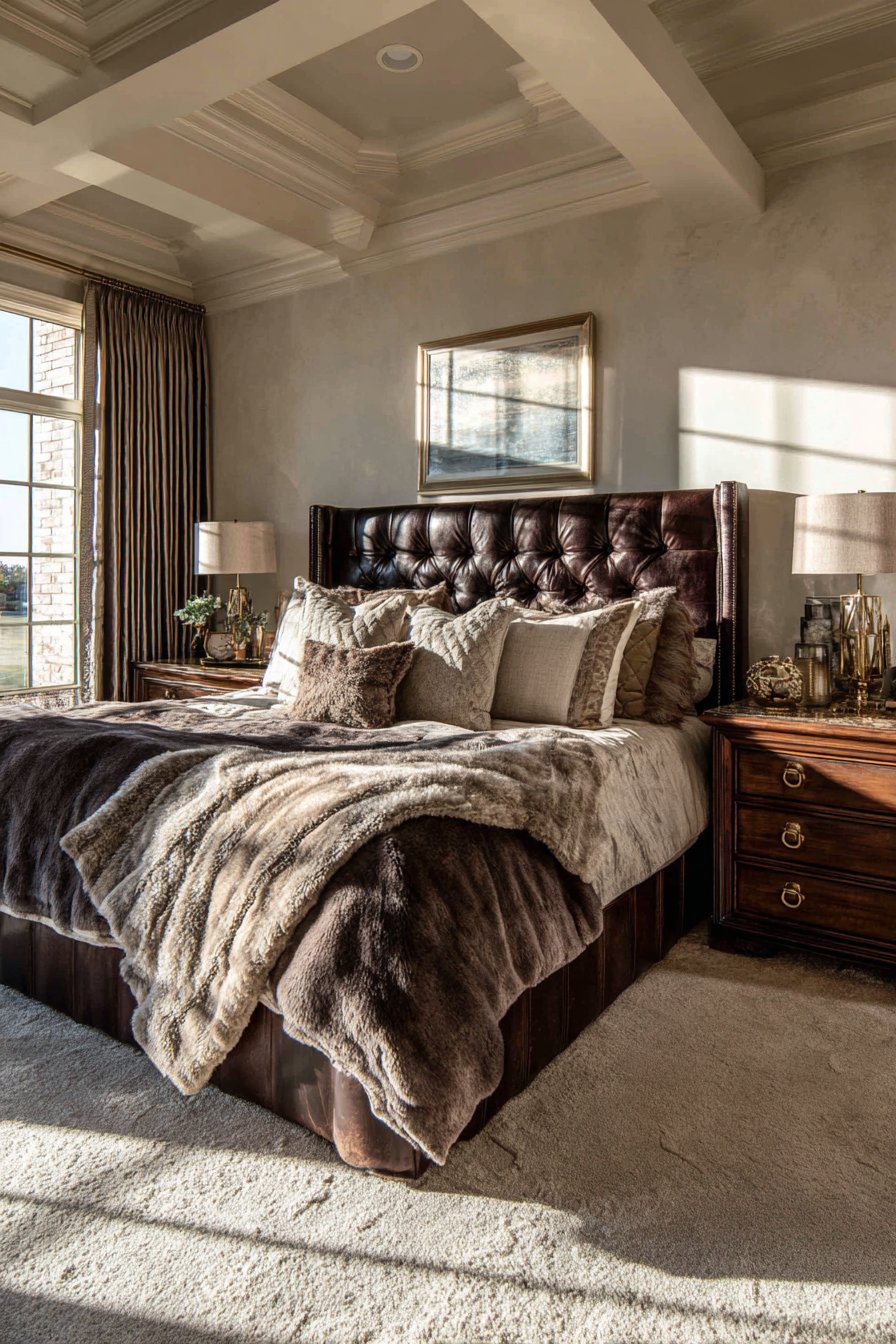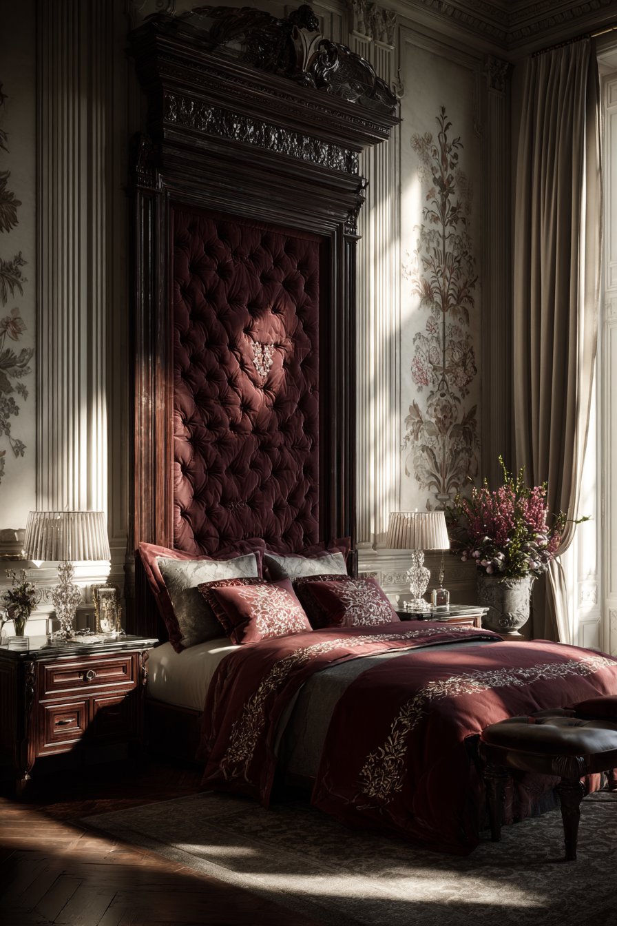 The foundation of this luxurious bedroom begins with an extraordinary upholstered bed. A tufted headboard extends dramatically to the ceiling. Rich velvet fabric creates an immediate visual impact and tactile luxury. Intricate carved crown molding frames the headboard beautifully. This architectural detail enhances the room’s vertical dimension.