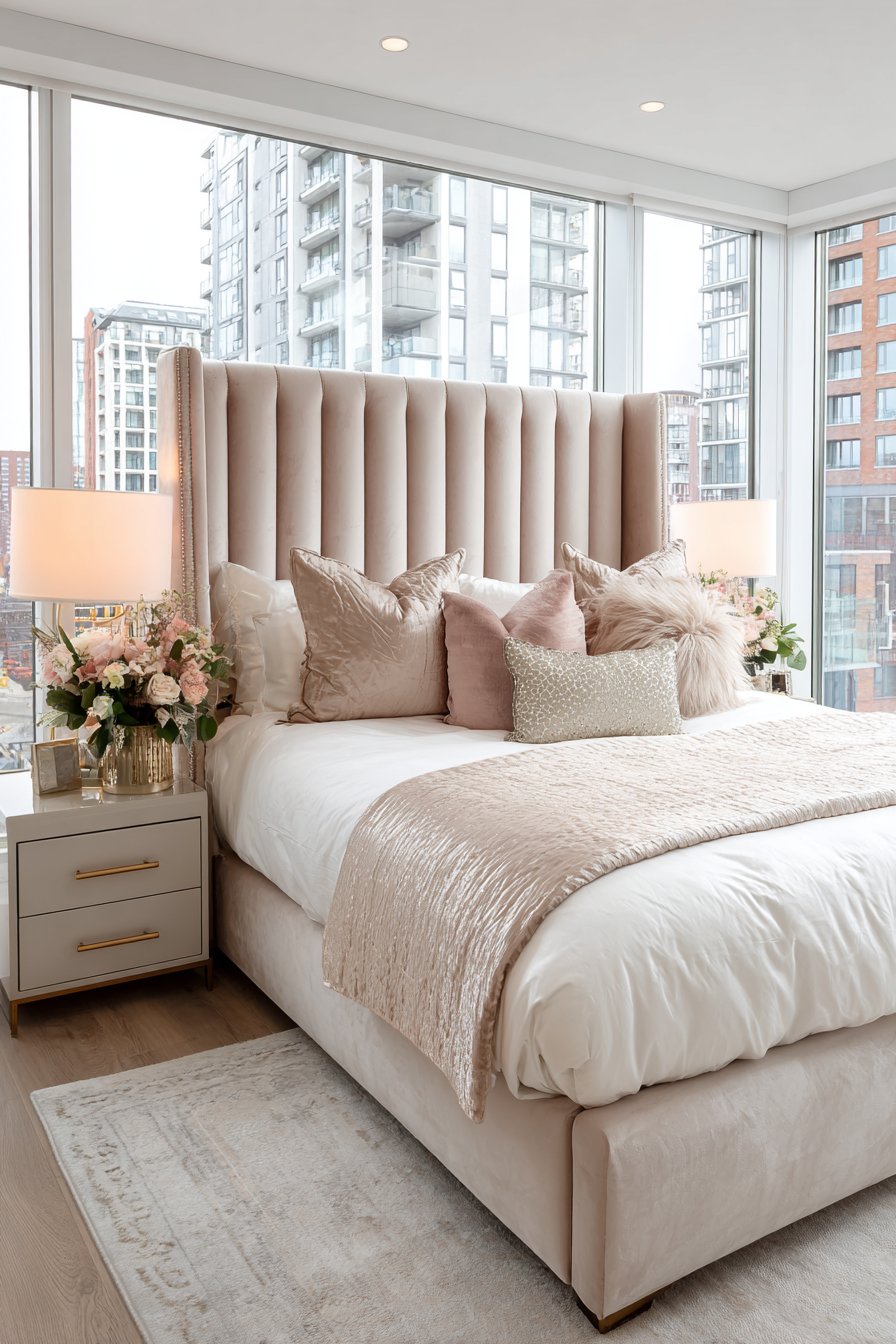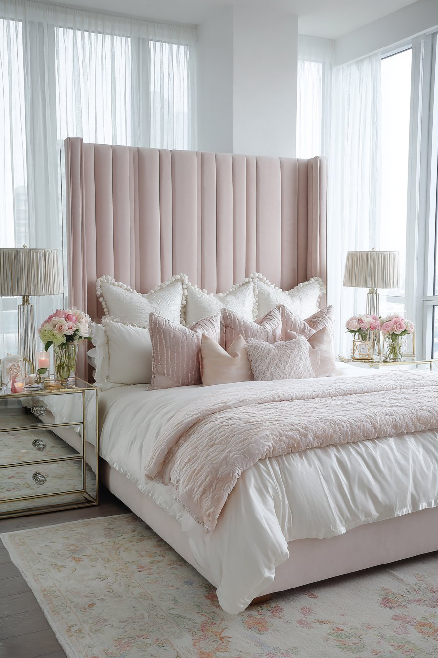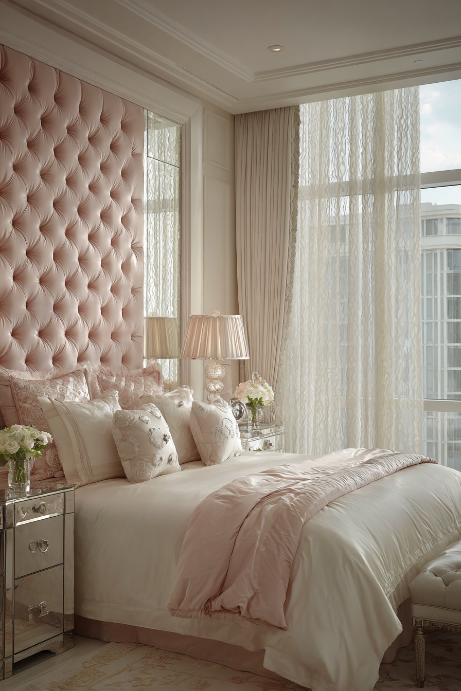 A grand platform bed features channel-tufted upholstery. Blush pink velvet extends wall-to-wall and floor-to-ceiling. This dramatic treatment creates a cohesive focal wall. The pink tone adds romantic softness.