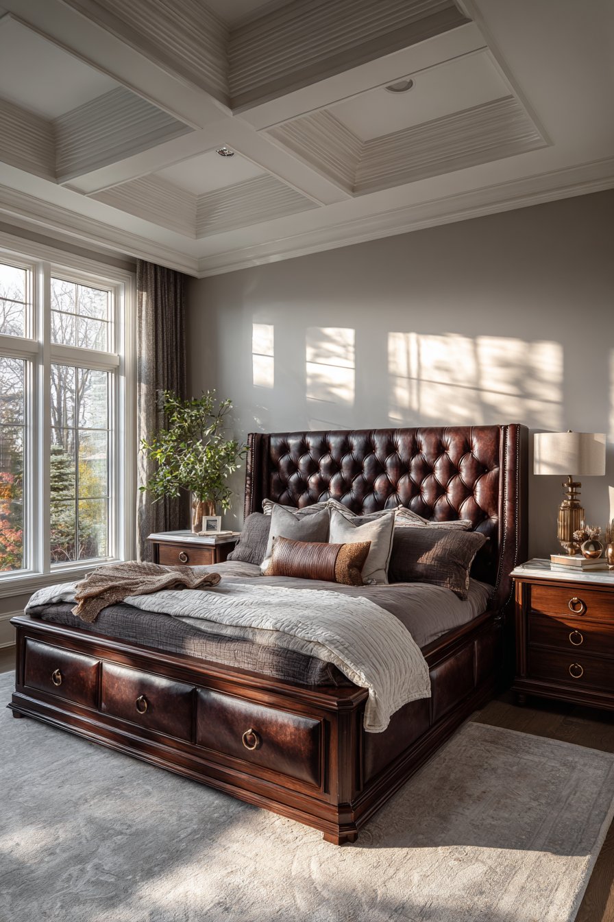 A tufted ottoman offers additional seating at the bed’s foot. Its placement maintains clear circulation paths. Afternoon light from large windows enhances the velvet’s rich color. Metallic accents catch and reflect this natural illumination beautifully.