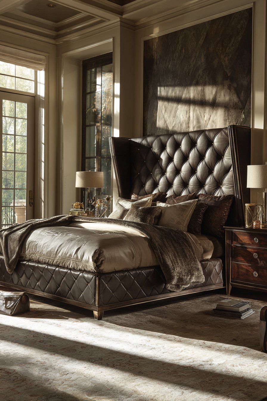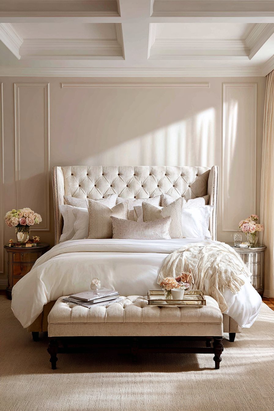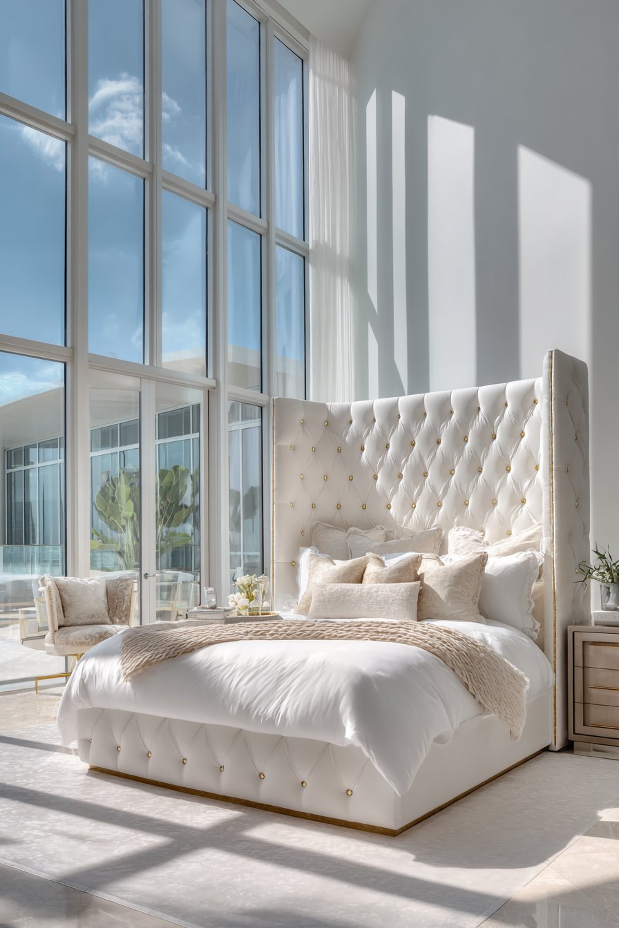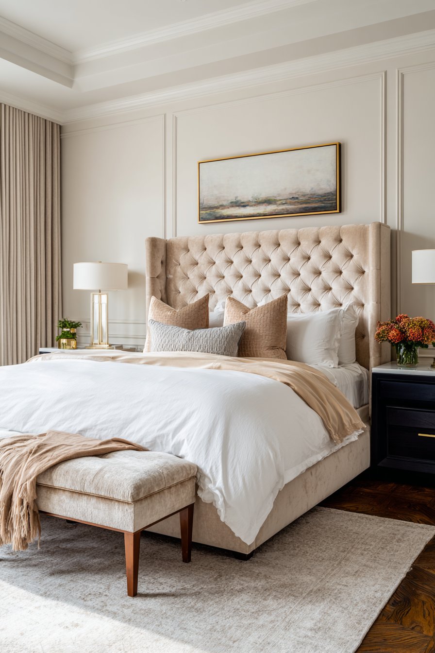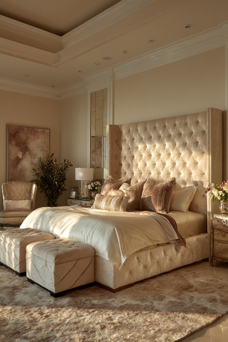 This sophisticated bedroom features an eight-foot tufted headboard. Champagne-colored velvet creates a luminous focal point. Deep button detailing adds three-dimensional texture throughout. The headboard’s substantial height draws the eye upward naturally.