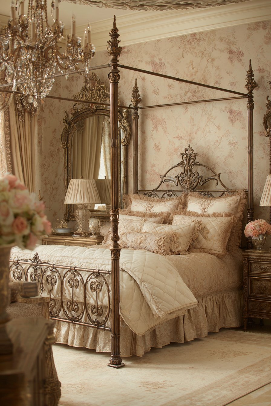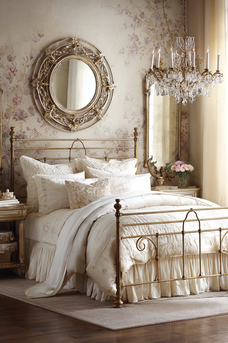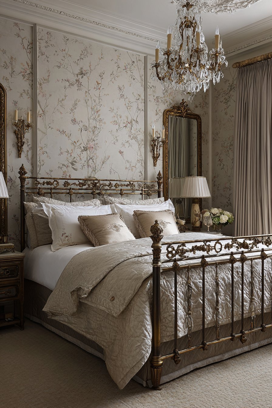 Gilt-framed mirrors above coordinating nightstands create symmetry. The matched elements establish visual harmony. Silk wallpaper with subtle floral patterns covers the walls. A vintage crystal chandelier with candle-style lights provides illumination.