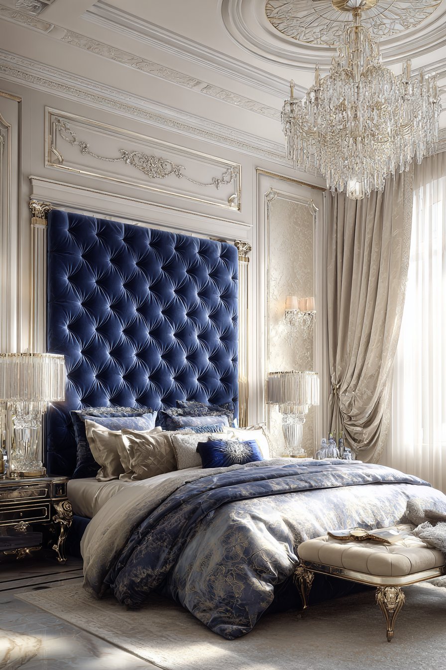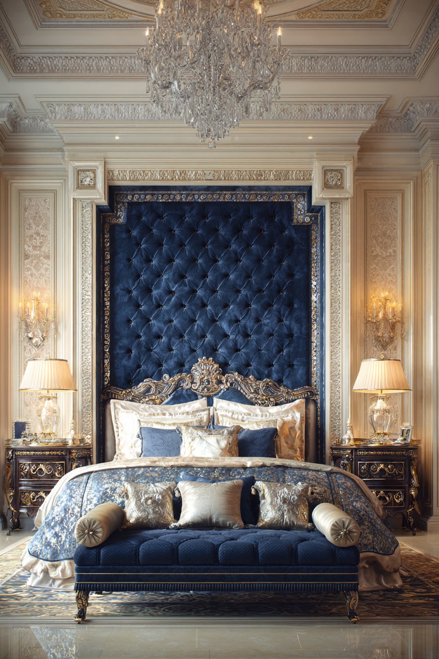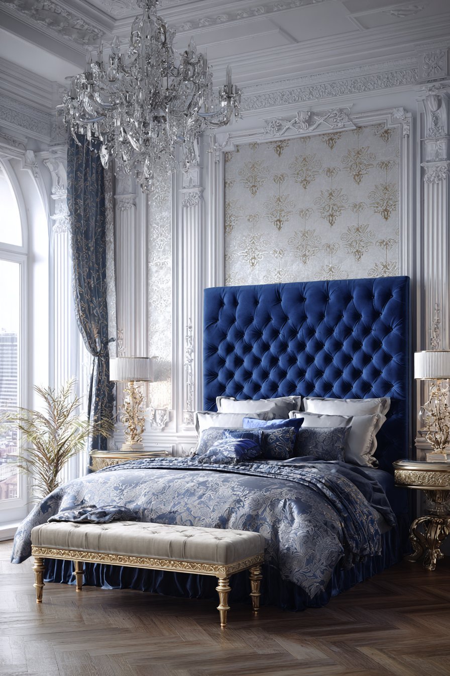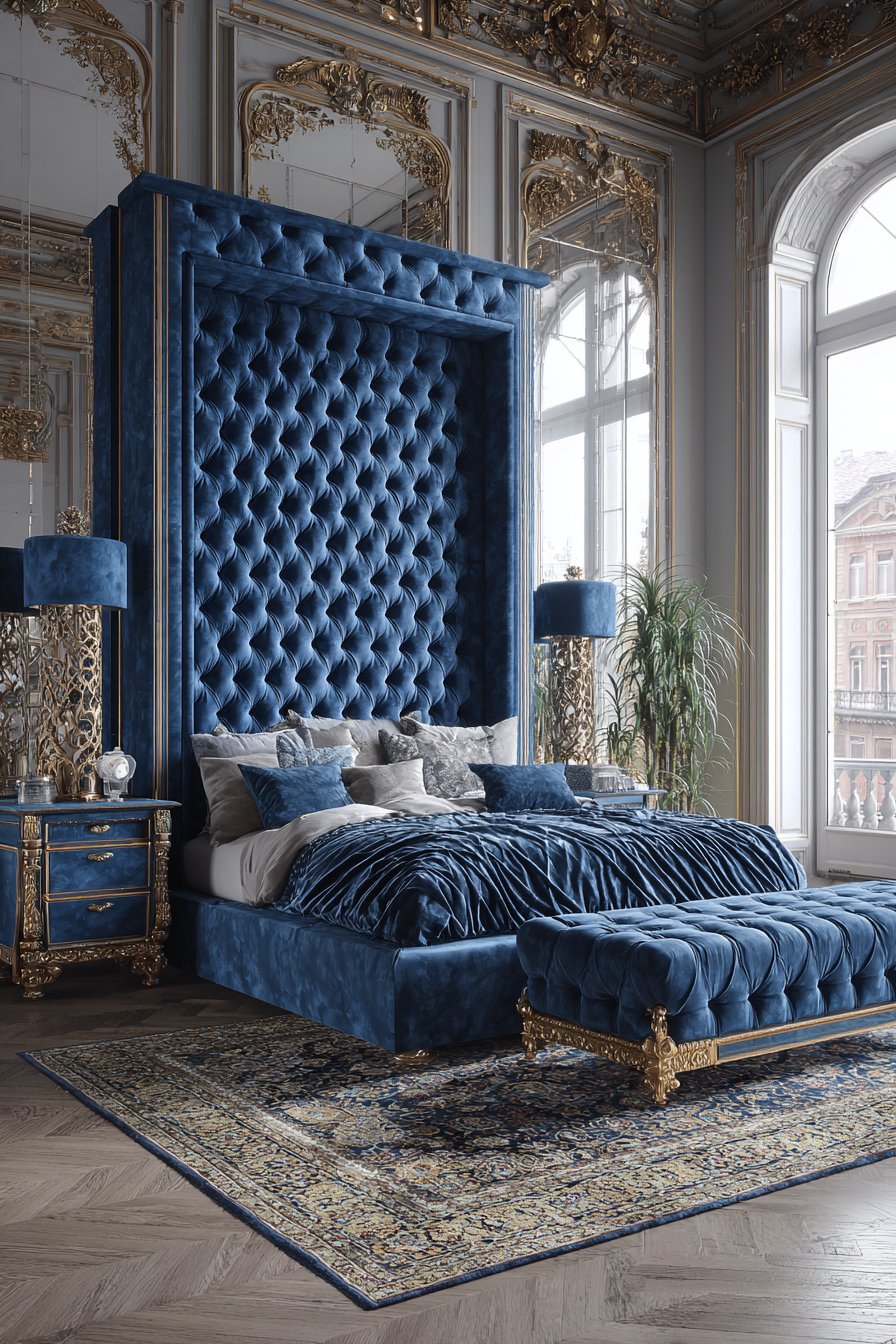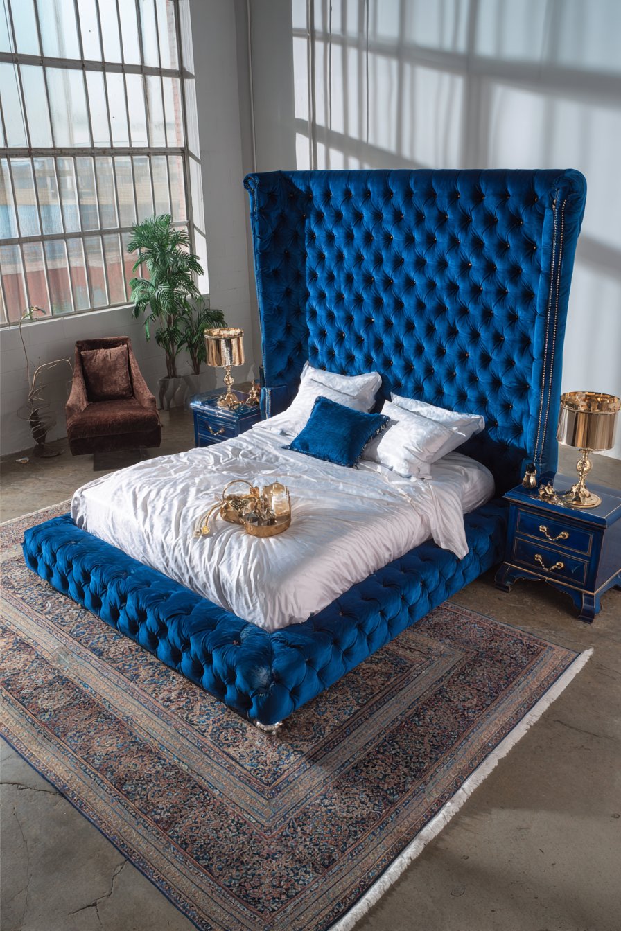 A monumental upholstered bed features floor-to-ceiling dimensions. Sapphire blue velvet creates breathtaking color impact. Crystal button details catch and reflect available light. The dramatic scale and bold color make powerful statements.