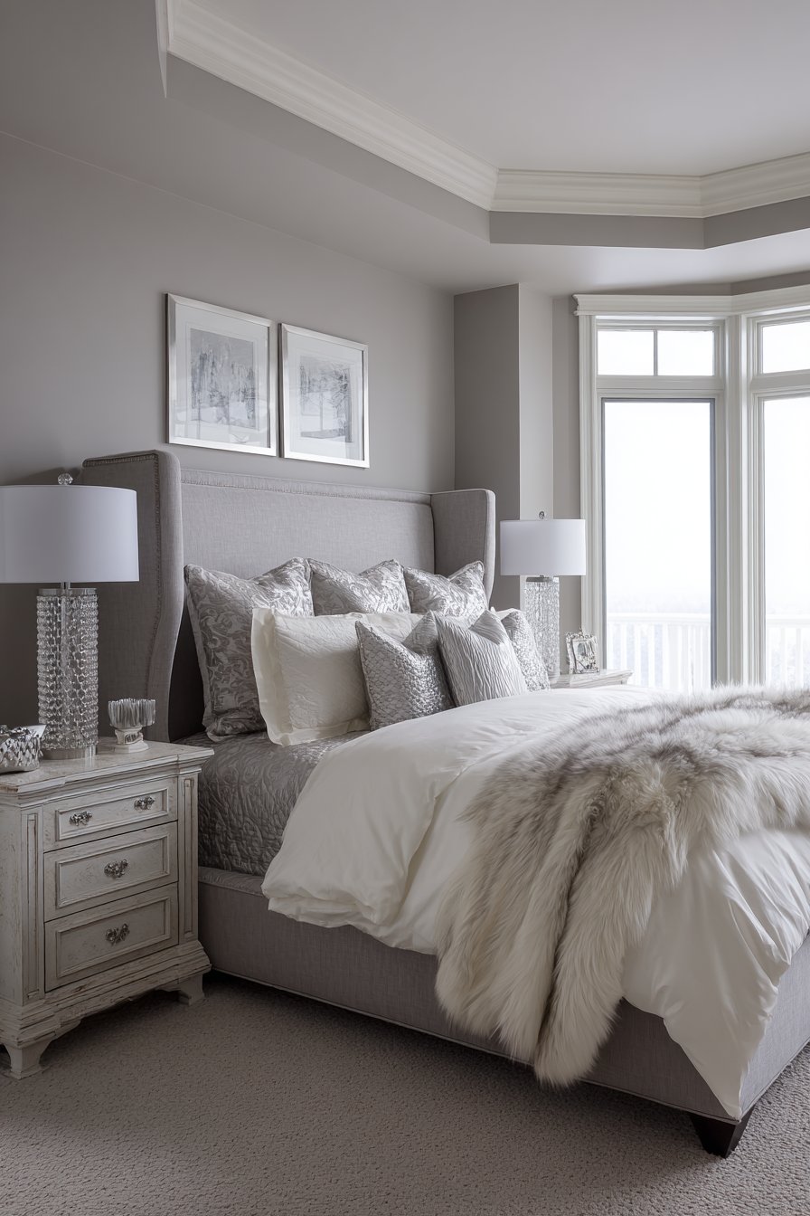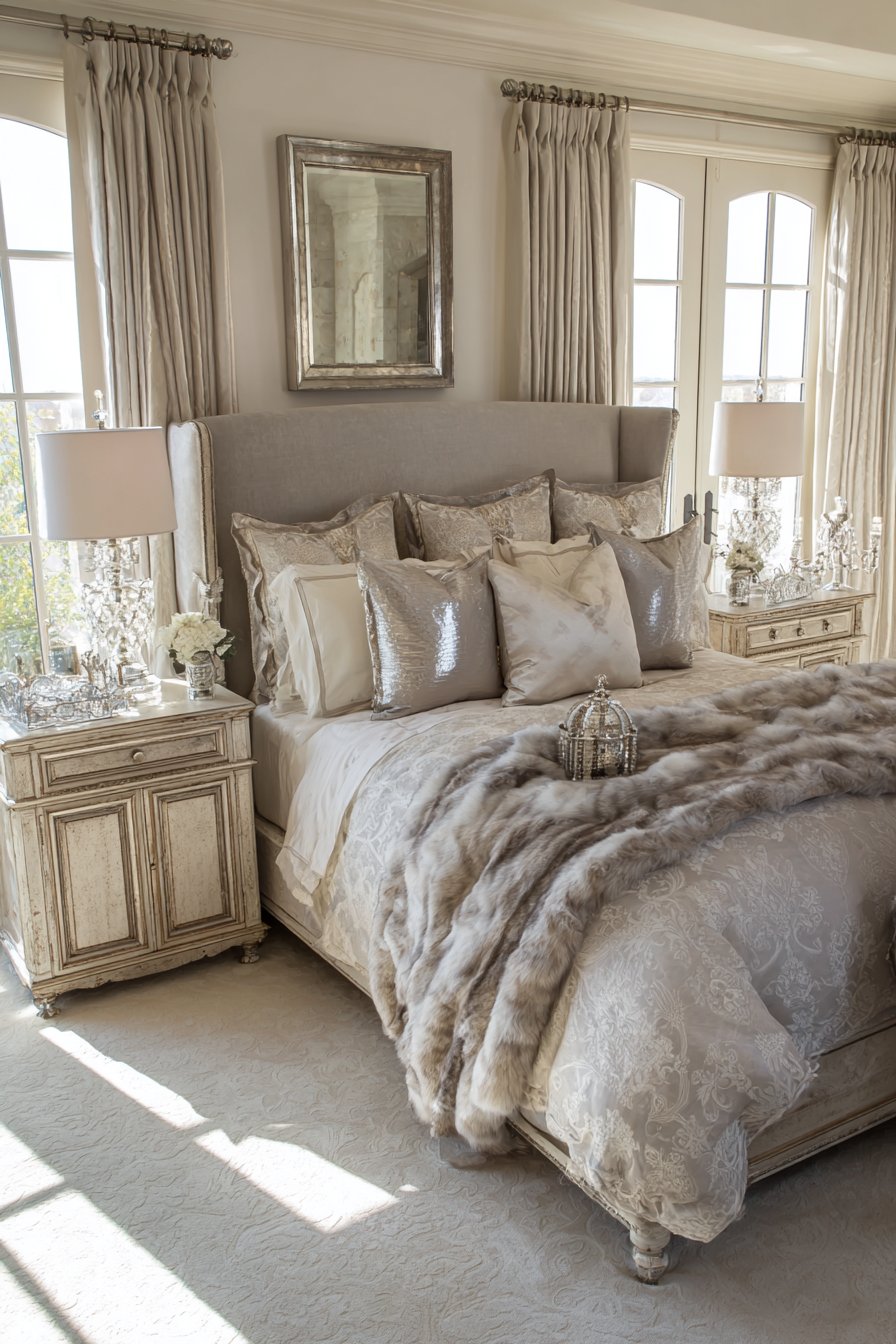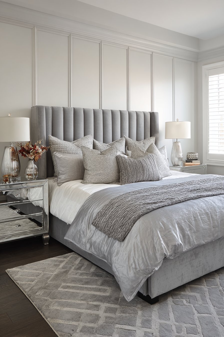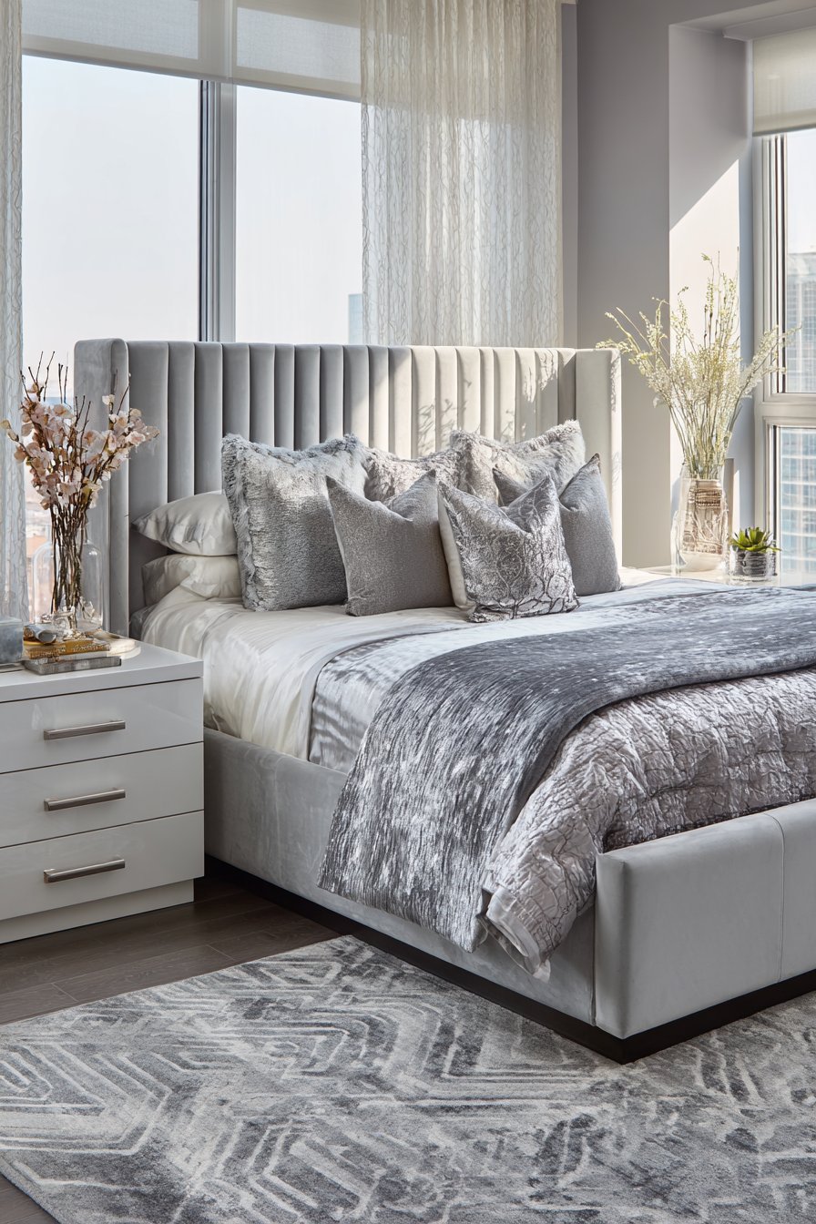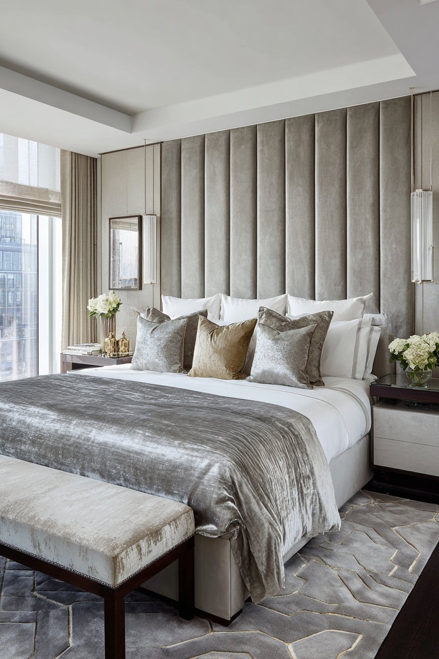 Hotel-quality white linens maintain fresh appearance. A silk coverlet in silver grey continues the palette. Pillows in varying sizes feature metallic and textured fabrics. The arrangement demonstrates sophisticated restraint.