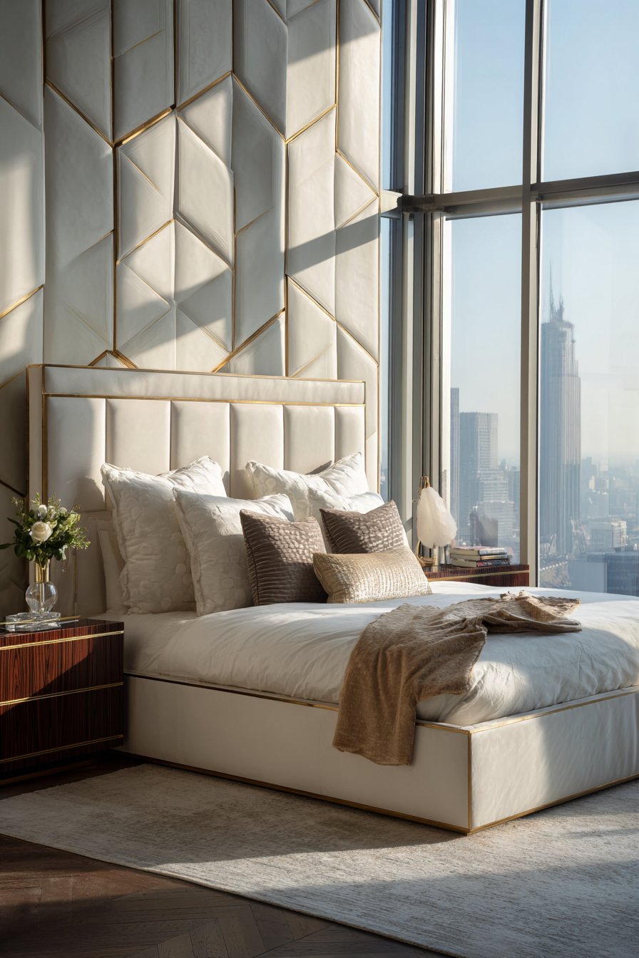 Crisp white Egyptian cotton sheets provide visual breathing space. A silk duvet in soft gold complements the headboard beautifully. Decorative pillows in metallic finishes add sparkle and dimension. The bedding arrangement balances opulence with restraint.
