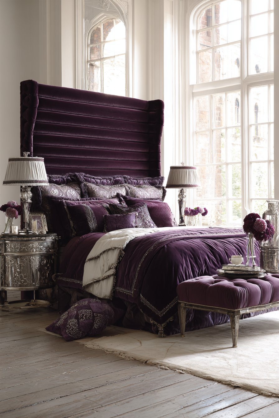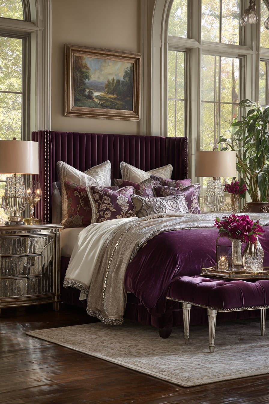 Elegant mirrored nightstands feature an antique silver finish. Crystal table lamps provide bedside illumination. A tufted bench in matching plum offers functional seating. The coordinated upholstery creates visual unity.